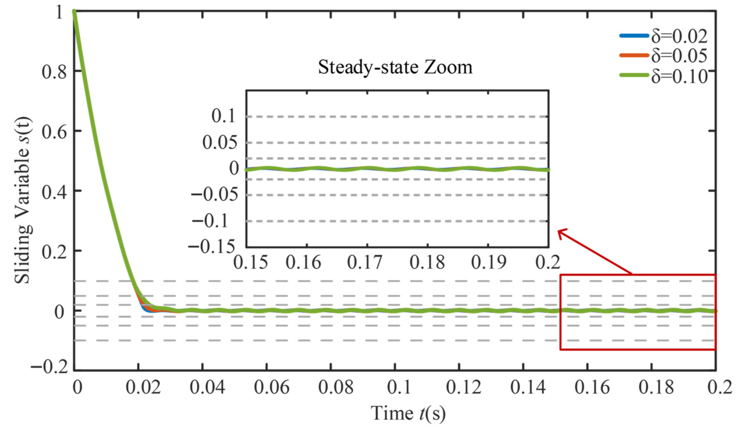It can be seen that the derivative of V1 is always less than zero, proving the stability of the system. This result also explicitly confirms the standard sliding reachability condition , providing theoretical support for the proposed reaching law. In particular, because s sat(s) > 0 for all s ≠ 0, one directly has for s ≠ 0, which explicitly confirms the standard sliding reachability condition .