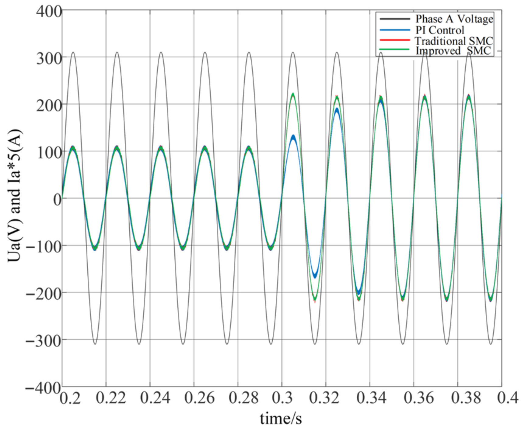 Figure 7. In all cases, the grid current follows the phase of the corresponding grid voltage, indicating correct power factor regulation. However, noticeable differences appear in the transient response: both the PI-based scheme and the SMC with a traditional reaching law exhibit slower stabilization, whereas the improved reaching-law-based SMC achieves a much faster settling process, reflecting superior dynamic performance.