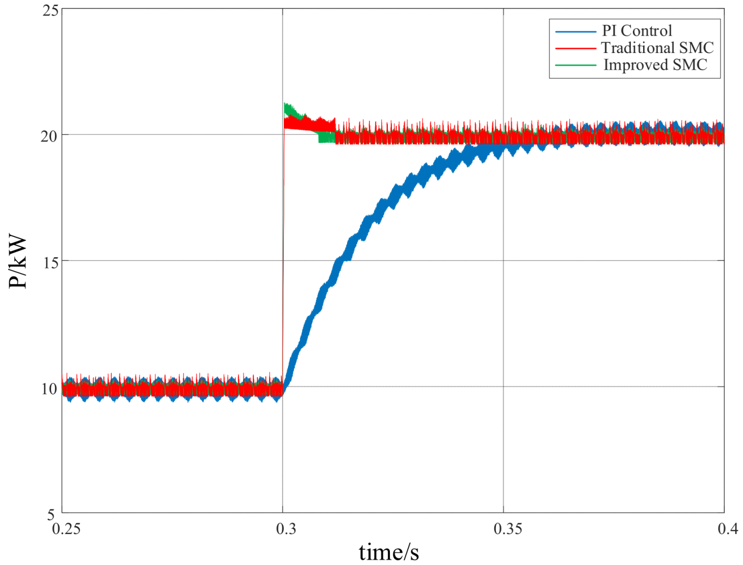 Figure 8. Under PI-based regulation, the system requires a relatively extended period to settle to a stable operating point. When SMC with a conventional reaching law is applied, the active power variation becomes smoother and the stabilization process is moderately improved. A further enhancement is achieved by introducing the improved reaching law, which significantly shortens the regulation time and enables the active power to reach a steady state more rapidly.