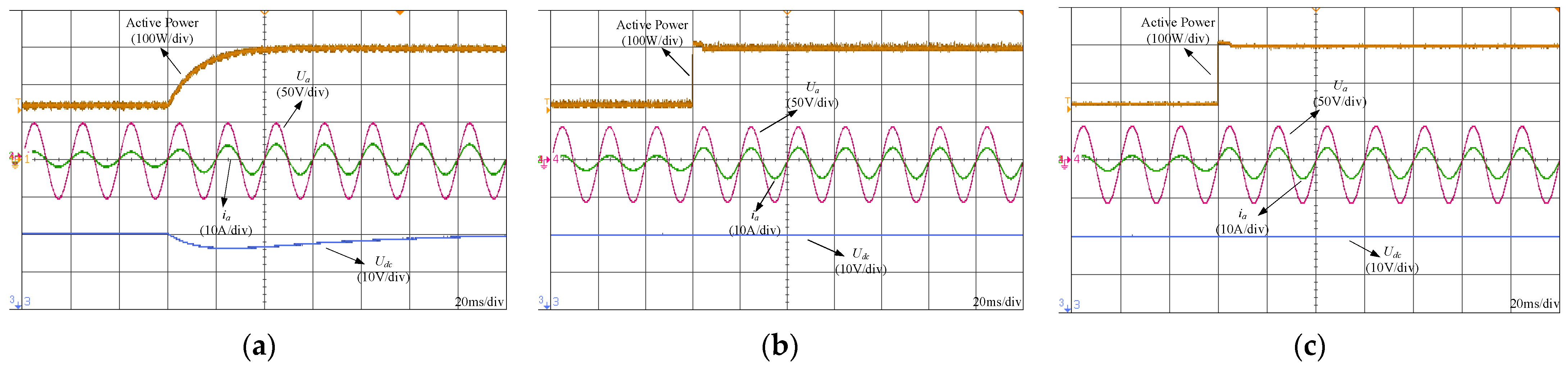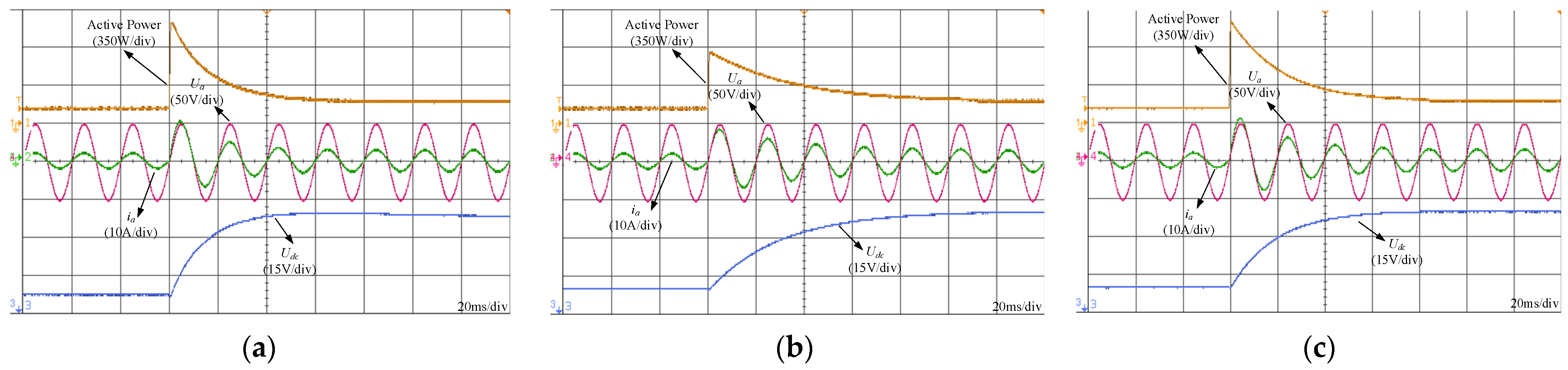 Figure 5a, the DC-link output voltage settles at approximately 0.2 s, accompanied by a voltage drop of about 40 V during the transient process. In