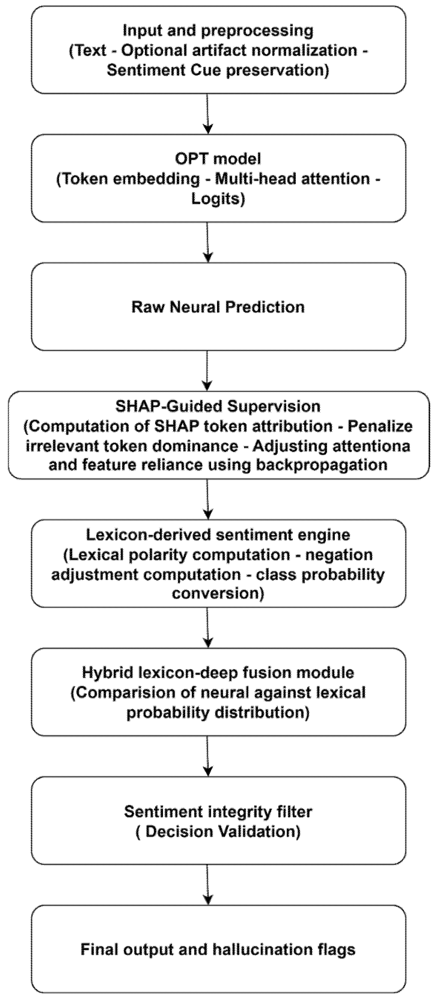 34] offer comprehensive architectural transparency and enable access to parameter-efficient fine-tuning techniques. Consequently, the use of the OPT model as the base architecture for the proposed hallucination-aware SA framework is driven by a variety of methodological, practical, and scientific considerations. The open-source nature of OPT’s framework allows researchers to fine-tune the attention flows and loss components internally, and thus integrate hallucination mitigation techniques such as SHAP-guided regularization and SIF into the training process. OPT’s decoder-only design is in line with the autoregressive reasoning required for SA tasks in which context changes over time. Moreover, the balanced parameter scales of the model enable experimentation with limited resources while preserving robustness. Within the proposed study, OPT supports domain-aware fine-tuning and hybrid lexicon-deep fusion.