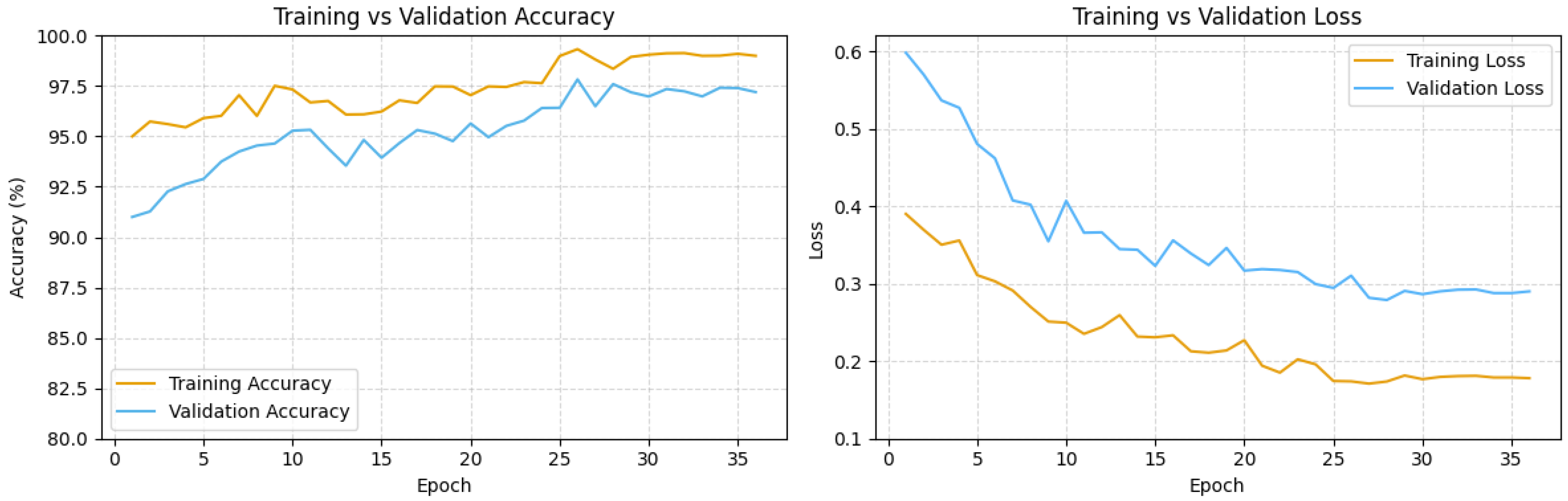 37] was employed to quantify the extent of unsupported or semantically unjustified sentiment predictions, as identified through an expert-assisted evaluation protocol. Monitoring of training and validation curves aimed to evaluate convergence stability and generalization behavior, whereas statistical consistency was assessed using mean values and confidence intervals. The inference efficiency was estimated as the mean inference time per sample on the GPU. Additionally, external robustness was assessed using Dataset 2, an unseen test set.