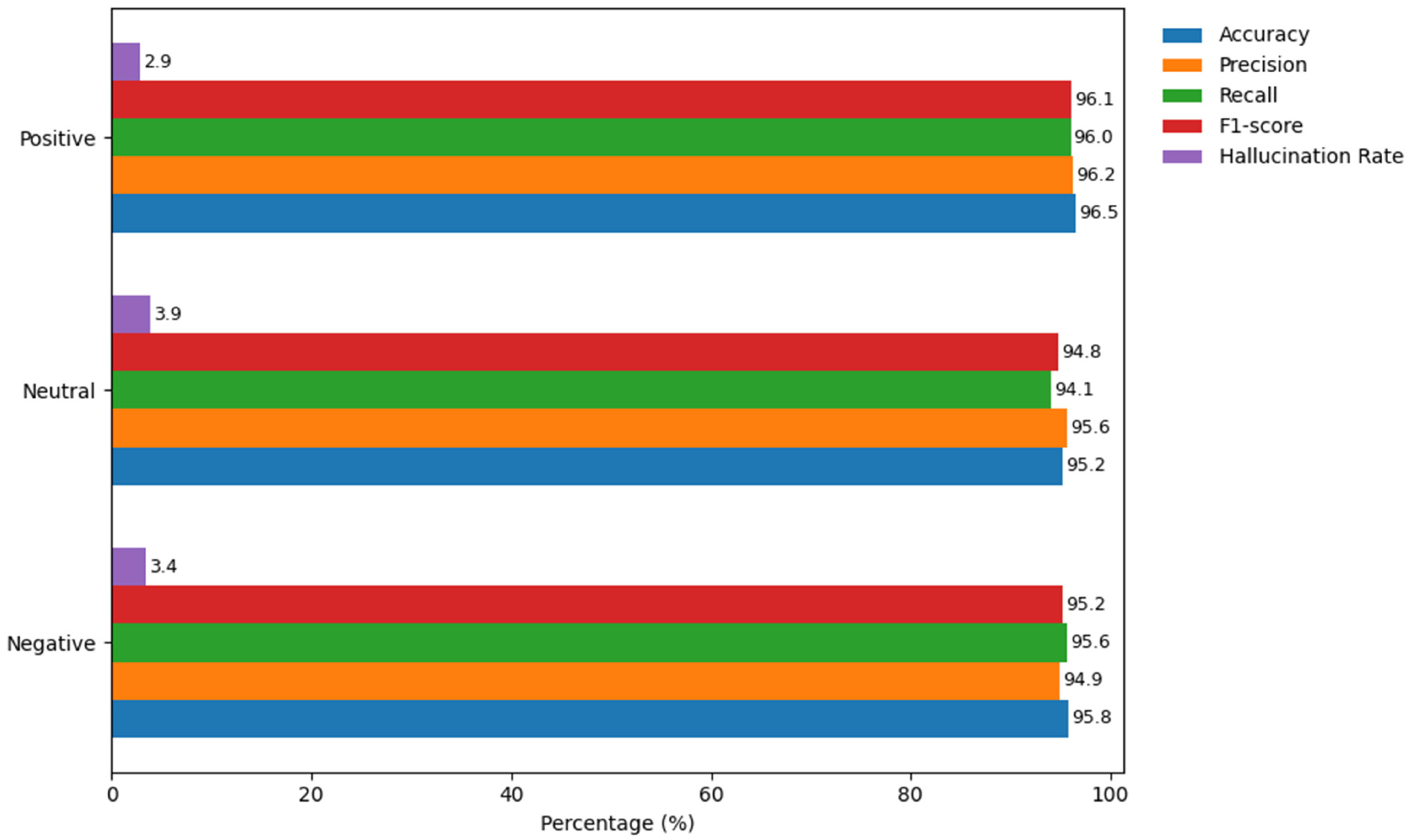 Figure 3 shows the class-wise performance of the hallucination-aware sentiment analysis model on Dataset 2, which is an external and unseen evaluation benchmark. Unlike Dataset 1, Dataset 2 combines content from diverse platforms and exhibits a higher degree of linguistic variation, making it a realistic approximation of real deployment. A critical observation is a controlled hallucination rate below 4% for each class, even in the neutral class, which is traditionally the most challenging due to weak or implicit sentiment signals. The high accuracy, precision, recall, and F1 scores across the negative, neutral, and positive classes show that the model generalizes effectively outside the training distribution. This suggests that the learned representations are not overfitting to dataset-specific patterns.