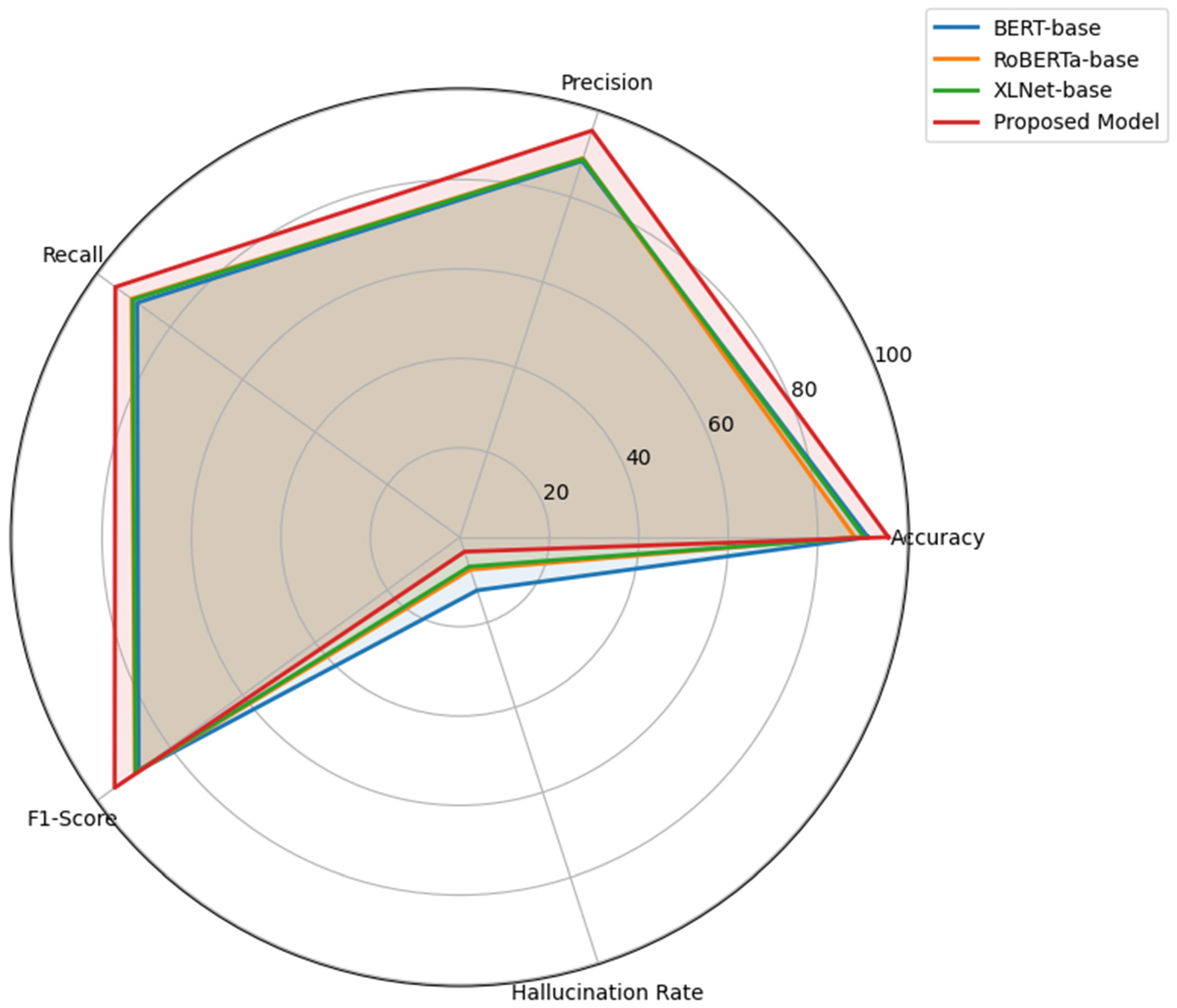 Figure 4 shows that the proposed hallucination-aware framework is not only superior to current transformer models in predictive power but also fundamentally superior in decision reliability. The visualization highlights a uniform and significant performance gain for the proposed model across all evaluation metrics, while achieving a lower hallucination rate. Unlike conventional transformers, the proposed model exhibits remarkable performance. Notably, unsupported polarity inferences reveal the shortcomings of the baseline models, resulting in high hallucination rates. This confirms that strong classification performance is not sufficient to guarantee semantic reliability, especially in the case of domain shift. The proposed architecture overcomes this limitation by incorporating semantic grounding and attribution regularization into both training and inference.