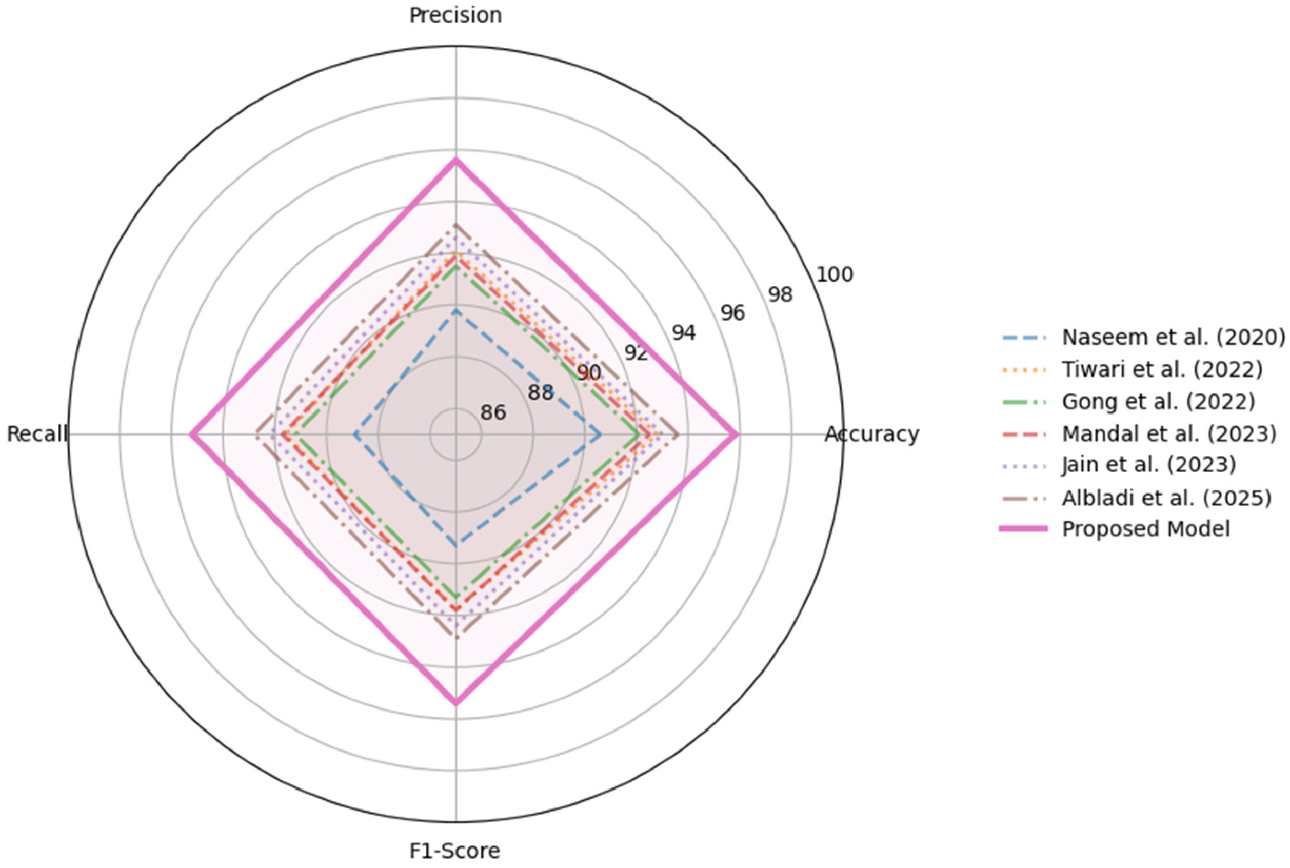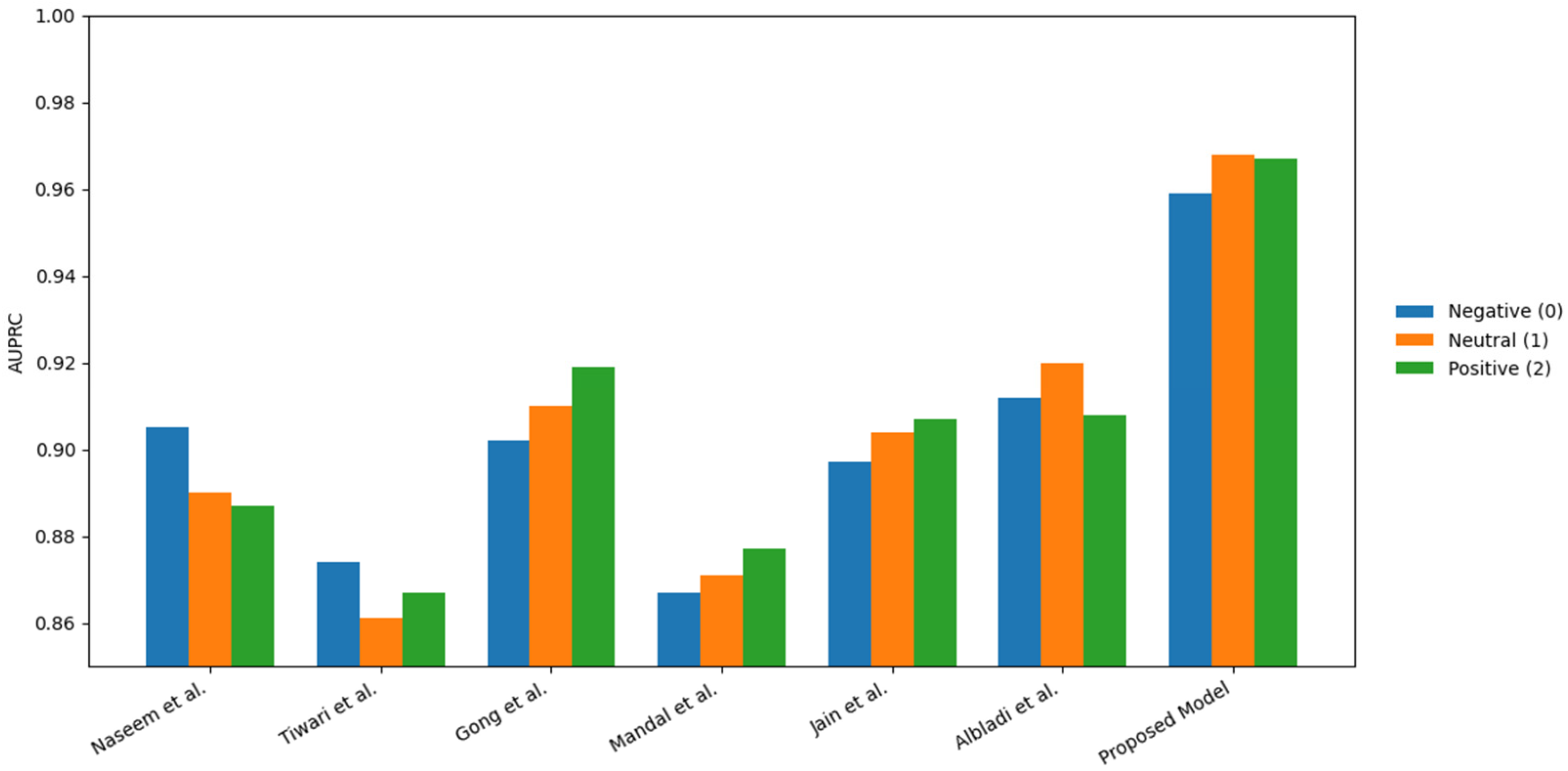 Figure 7 offers empirical evidence of the effectiveness and reliability of the proposed model. AUPRC emphasizes the potential of the model in maintaining high precision while achieving better recall value. It is evident that the SIF prevents the model from generating high-confidence predictions without sufficient textual evidence. The stabilization of the PR curves at higher recall levels shows the significance of the proposed confidence-based lexicon-deep fusion mechanism. For sentiment classes with overlapping or weak polarity cues, existing models’ lower AUPRC values suggest that they are incapable of maintaining high precision throughout recall levels. These models frequently produce overconfident predictions in ambiguous contexts, thereby increasing false positives. Contextual embedding or static feature fusion methods-driven models are unable to prevent hallucinated sentiments. The findings reinforce the suitability of the proposed model for real-world social media SA.