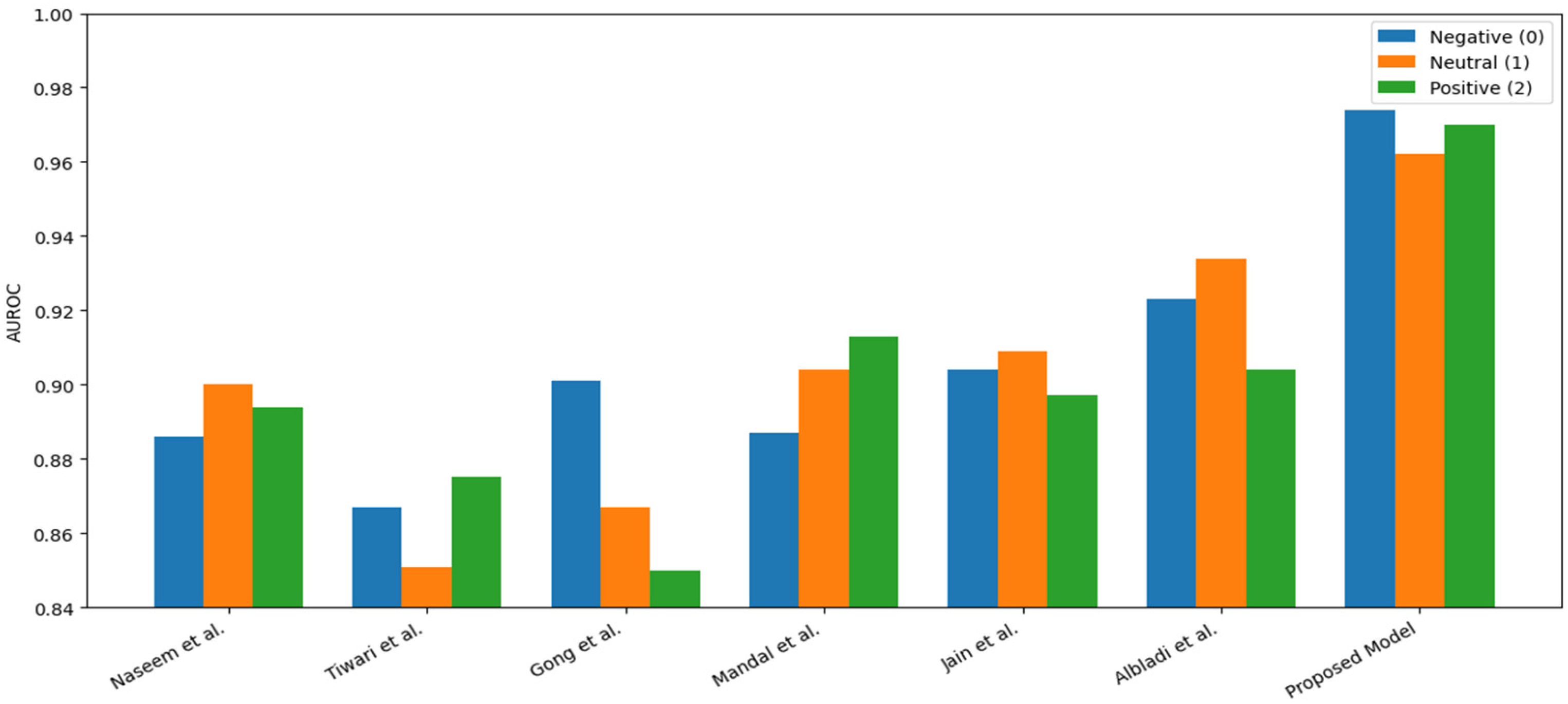 33], the proposed model emphasizes semantic accountability in which each prediction is supported by verifiable textual evidence. This transformation addresses the challenges of transformer-based SA models. The key finding emerging from the evaluation shows that the model maintains high discriminative power under ambiguous conditions. The AUROC scores indicate the effective performance of the classifier across the sentiment categories. Existing models achieve considerable classification accuracy. However, their hallucination rates are higher than the proposed model when polarity cues are subtle or embedded in complex discourse.