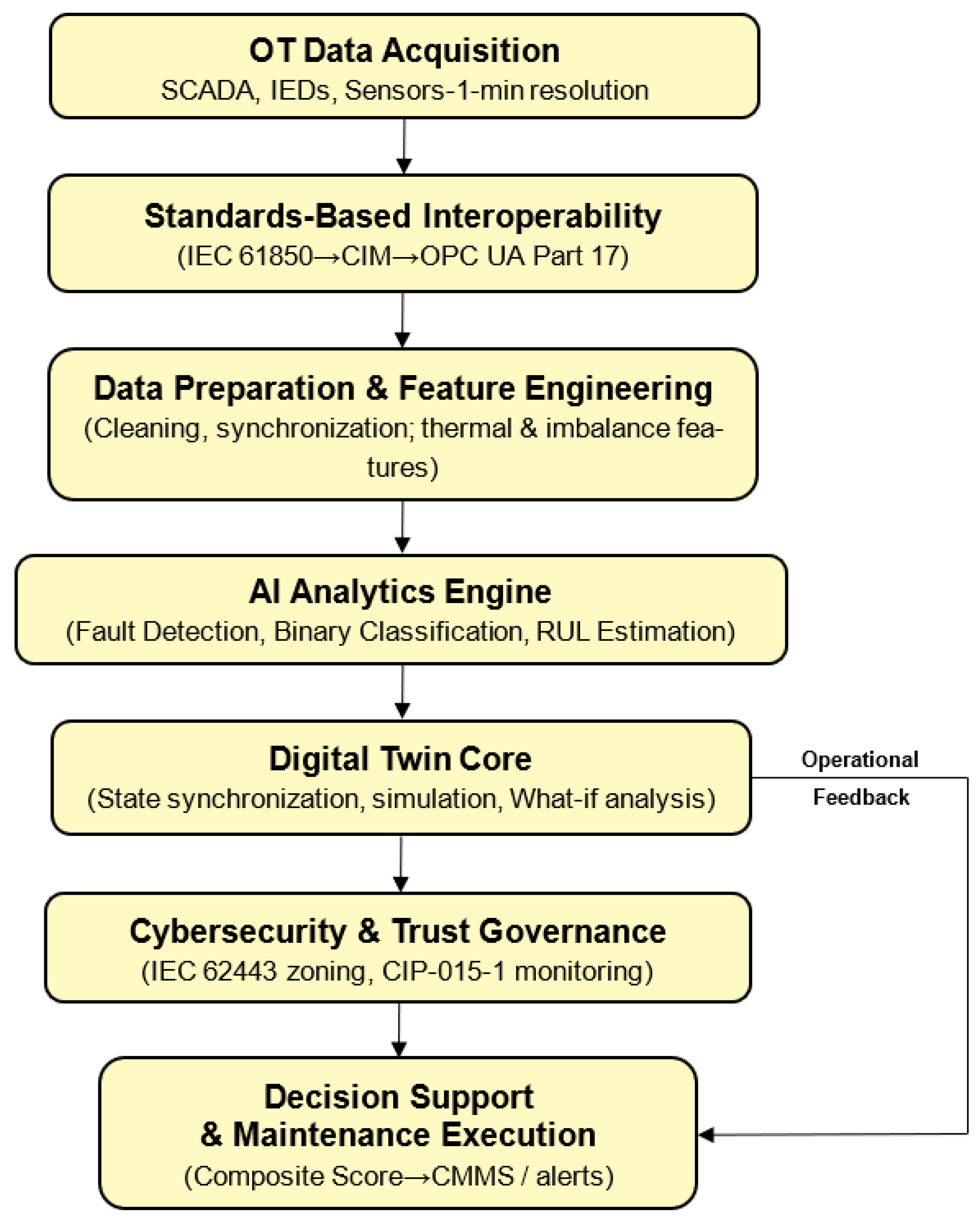 The following is uniquely integrated: (i) semantic interoperability using IEC 61850/CIM/OPC UA Part 17; (ii) defense-in-depth cybersecurity enforcement aligned with IEC 62443 and NERC Critical Infrastructure Protection (CIP) Reliability Standard CIP-015-1 (Cyber Security—Internal Network Security Monitoring), which mandates internal network security monitoring to improve detection of anomalous or unauthorized activity; (iii) stacked ensemble models for enhanced prediction robustness; (iv) a decision-support layer capable of maintaining synchronized operation with the SCADA/substation’s operational technology (OT) infrastructure systems in real time.
