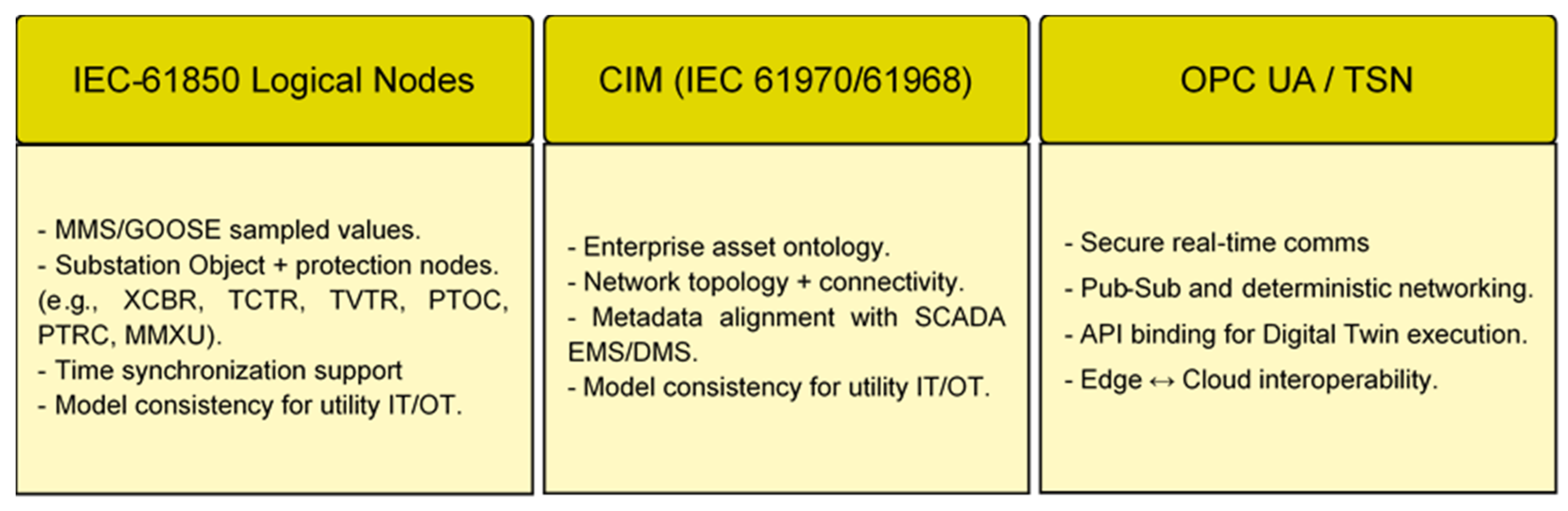 For electrical substations, achieving deployment-ready PdM requires standards-based operational interoperability. IEC 61850 and CIM define unified information models and communication protocols for asset data exchange, while OPC UA Part 17 enables scalable publish–subscribe messaging for cross-platform DT integration [