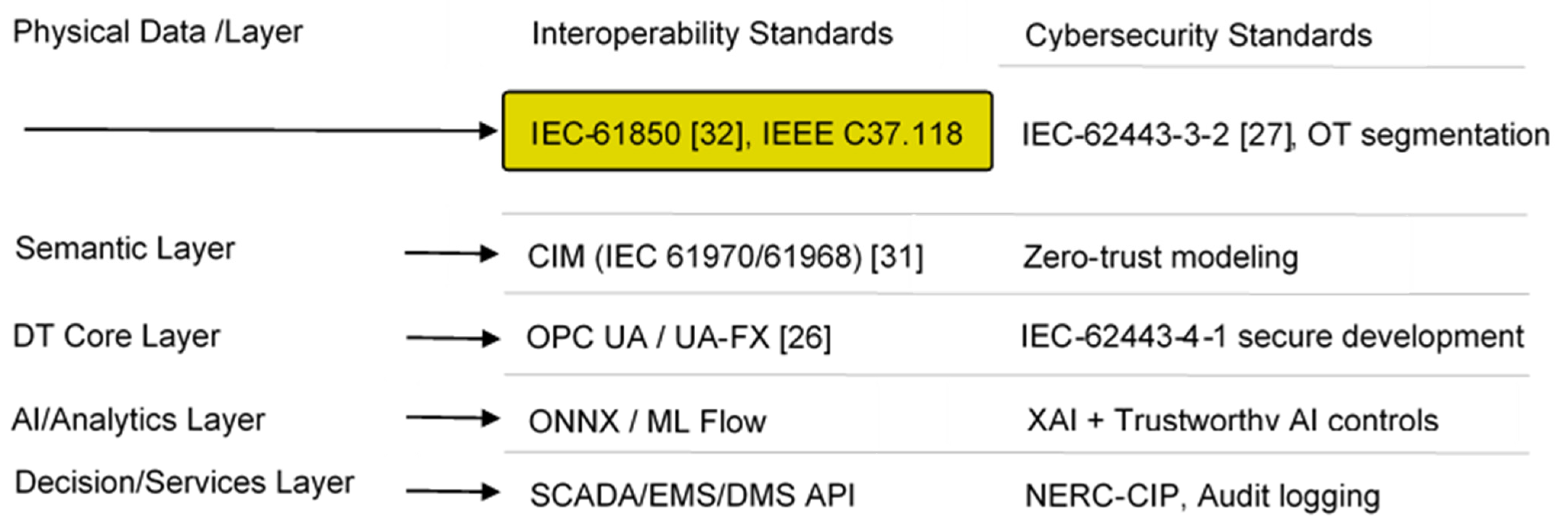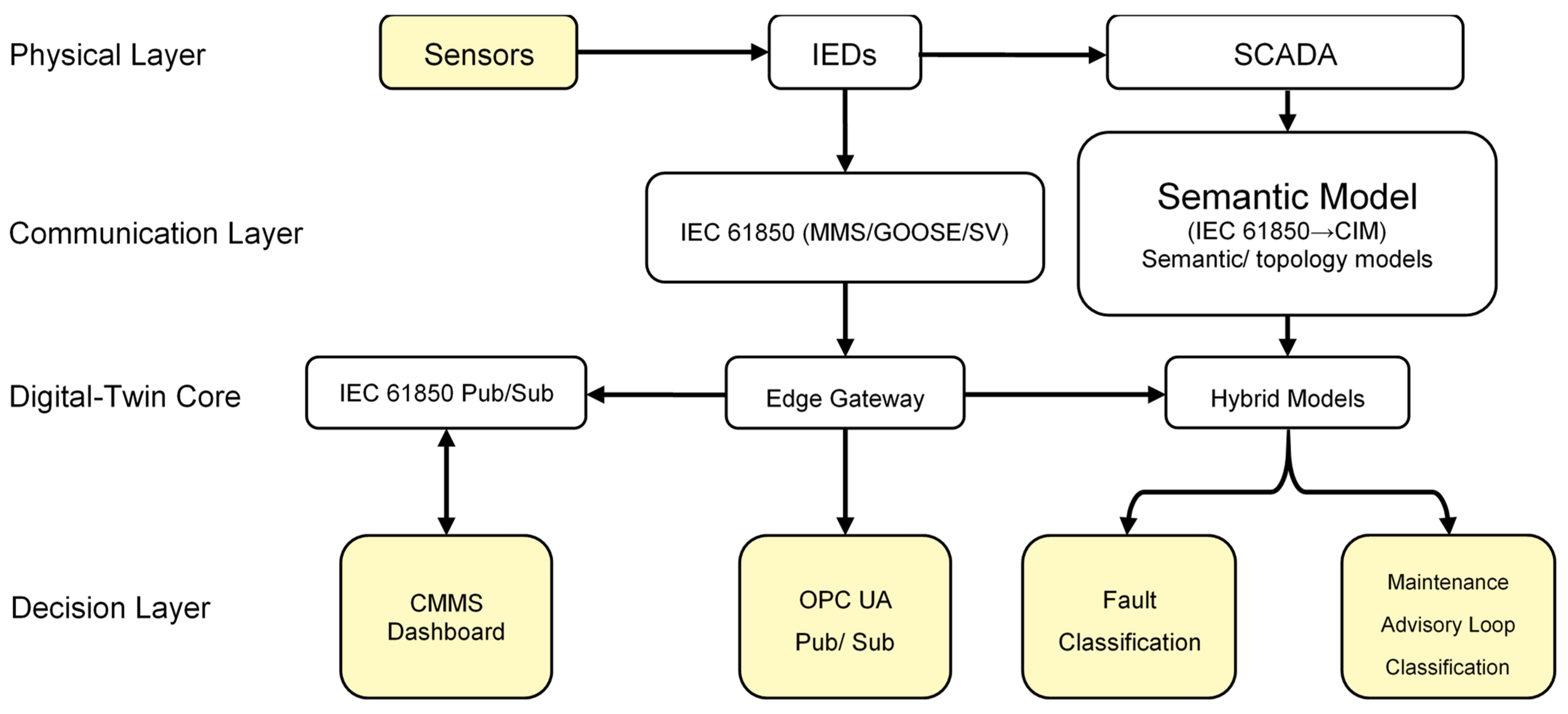 14]. These advances motivate a layered DT-enabled PdM architecture tailored to substation automation, where IEC 61850, CIM, and OPC UA Part 17 ensure semantic and operational interoperability, and IEC 62443 anchors cybersecurity and trust.