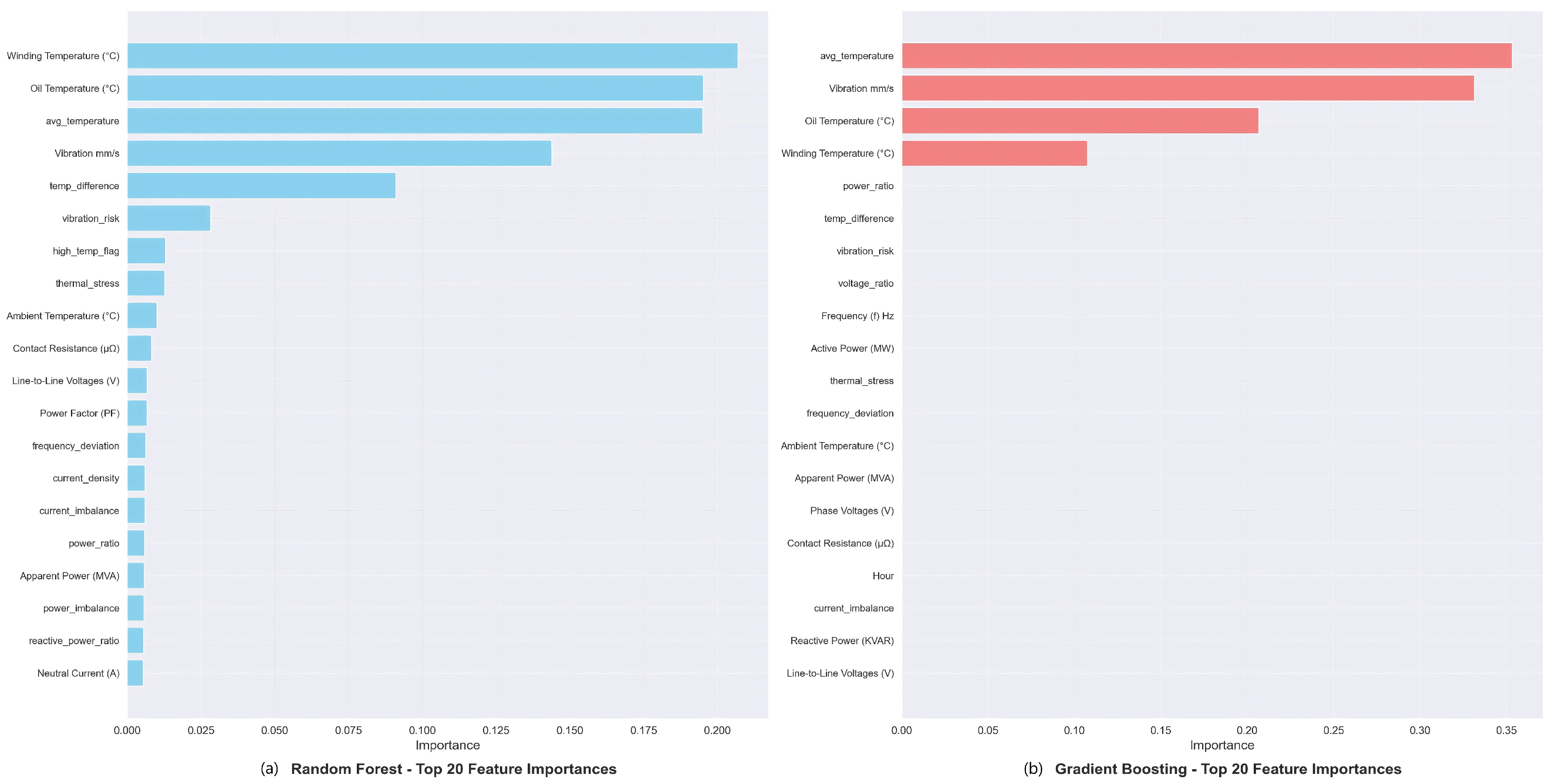 The dominant predictors identified by the explainability analysis are physically consistent with common degradation mechanisms in transformer–feeder operations. Oil and winding temperature levels and gradients reflect thermal stress accumulation, cooling-system anomalies, and hotspot-driven insulation aging; therefore, elevated temperatures and rapid thermal changes are meaningful precursors of incipient faults and reduced remaining useful life. Likewise, imbalance-related electrical indicators (e.g., phase-current asymmetry or derived imbalance indices) are strongly associated with unbalanced loading, loose terminations, contact deterioration, and asymmetric impedance conditions, which can induce localized overheating and accelerate degradation. Vibration-related features further capture mechanical looseness and abnormal operating states that may precede discrete fault events. Together, these findings confirm that the most influential features correspond to well-understood physical degradation processes, reinforcing the interpretability and engineering credibility of the proposed DT–PdM framework.