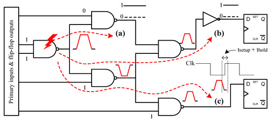 A radiation-induced SET at NAND2 gate output that is subjected to the three masking mechanisms, i.e., (a) logical, (b) electrical, and (c) timing, as it propagates through the circuit [22].