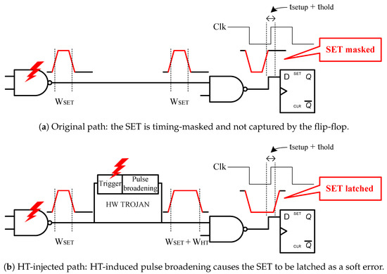In general, reliability trojans cause long-term faults and disrupt the proper operation of the design by exploiting reliability phenomena and issues [29,30]. Specifically, a reliability HT exploiting an occurring SET to attack memory elements of the design guarantees that the SET propagates from the targeted sensitive gate through the circuit and generates a soft error. This insurance is an essential element of the attack since, as mentioned before, not every SET propagates by default through the design to lead to a soft error. One way to increase the probability of propagation is by SET broadening, which can be applied by the reliability trojan. The HT is inserted in the design, so it affects the output of a targeted gate, and as a result, when a radiation-induced transient fault is generated, it also passes through the HT. The output signal of the reliability HT that is broadened enough to successfully realize the intended attack is returned to the original path. Figure 2 demonstrates the difference between the original circuit path and the path infected by the SET-based HT. In the original path, the generated SET is subject to timing masking, arriving outside the latching window. In contrast, when the HT is inserted, the SET is broadened by the trojan payload, allowing it to be latched by the flip-flop and resulting in a soft error.
