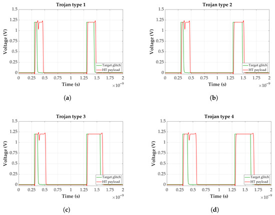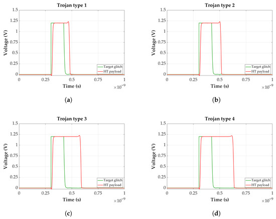 Extensive SPICE simulations were performed to determine the maximum and minimum transient glitch pulses needed for the proposed HT to be successful. As mentioned before, the target_glitch’s pulse is affected by many factors such as the angle and position of the particle hit and LET. As a result, consistent pulse generation is not easily achieved and variations will appear, calling for a need to study the probability of the attack occurring in the first place. Figure 5 demonstrates that for each configuration there is a range where the generated pulse would be sufficient to produce an effective payload. The closer the width of the generated glitch is to the minimum and maximum of each type’s functional range, the greater the likelihood that it will not work as designed. As far as the minimum boundaries are concerned, any smaller pulse than that would result in two separate output pulses, since the voltage would pass the threshold to logic 0 and the circuit would fail to broaden the pulse, instead creating two pulses. On the other hand, for any pulse above the maximum values, the pulse-broadening circuitry would be unable to widen it further, and the output pulse would remain target_glitch unchanged, rendering the HT redundant for those cases. Thus, for these specific four types and after the SPICE simulations were run for various pulses, the glitch’s pulse width was set at 120 ps as a sweet spot. The size range needed for the specific reliability HT to be functional is enough to be a valid concern. The simulations and their results, as shown in Figure 4a–d, attest to the severity of the threat and reinforce the idea that it needs to be further studied to develop effective countermeasures against it in addition to detection techniques.