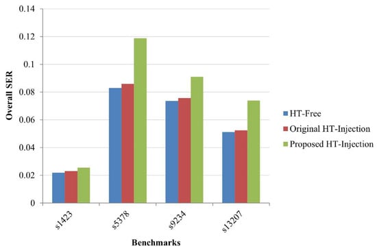 Finally, Figure 7 depicts the SER evaluation for four ISCAS ’89 benchmarks, comparing the SER in circuits without HTs, the theoretical original HT-injection approach from [16], and the proposed methodology. The results show that the proposed method results in the highest increase in SER across all benchmarks, even if only a limited number of HTs is integrated. This fact confirms that combining HTs with gates of moderate sensitivity significantly worsens overall circuit susceptibility. The inserted HTs strengthen the generated SETs, thereby increasing the vulnerability of the affected gates and elevating the likelihood that these transients will be captured by memory elements, ultimately amplifying the overall IC vulnerability.