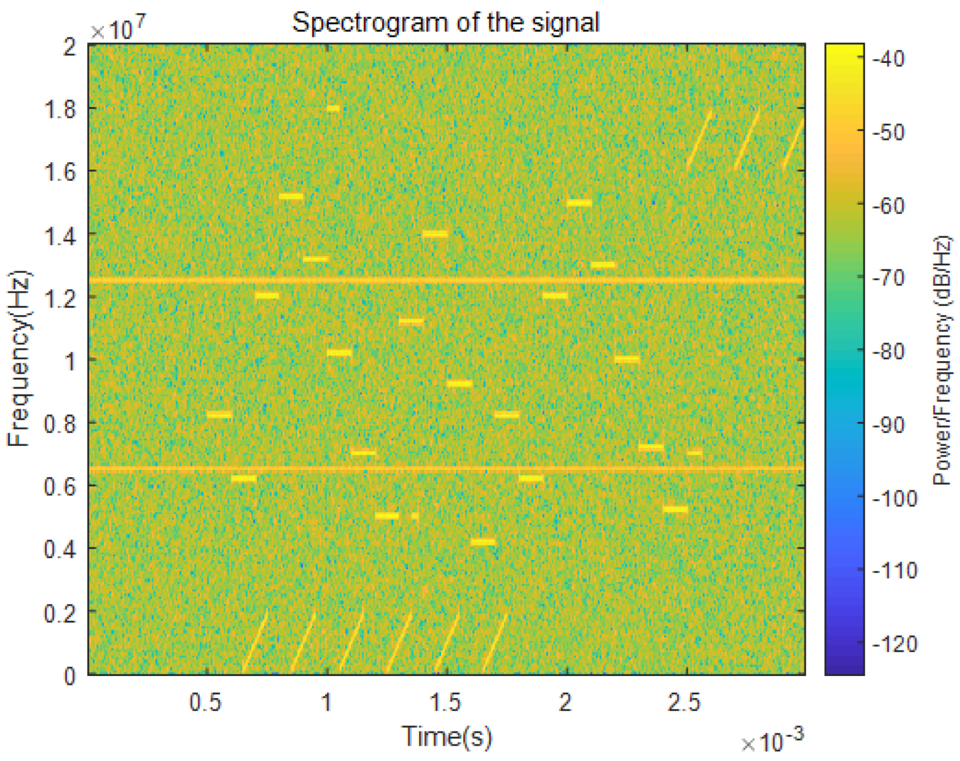 - Frequency-hopping signals appear as periodic horizontal segments.