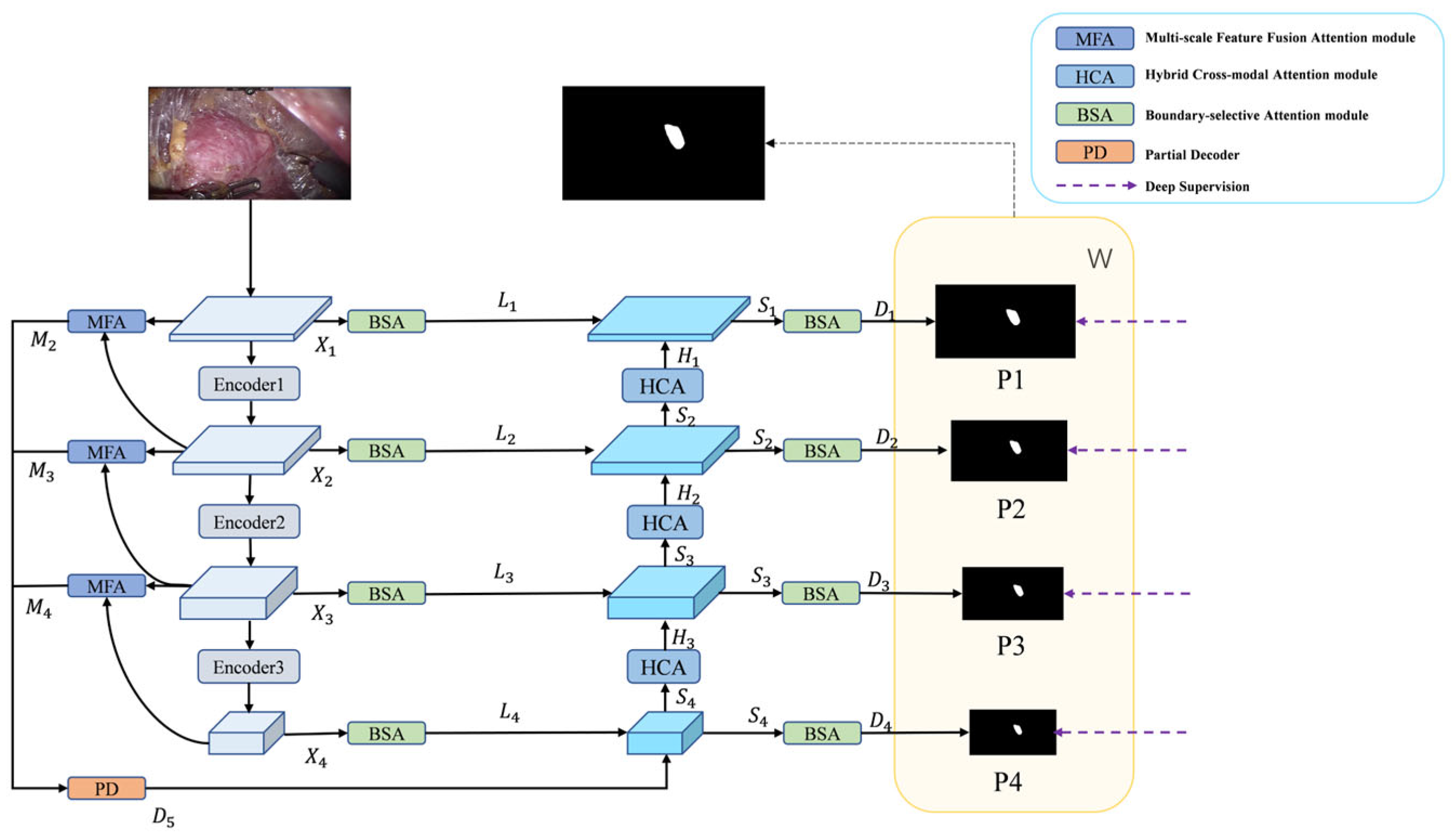 - We propose a boundary selective attention module called BSA, which specializes in dealing with boundary regions and heightens the model’s perceptual acuity towards edges, so that different levels of features are boundary-aware.