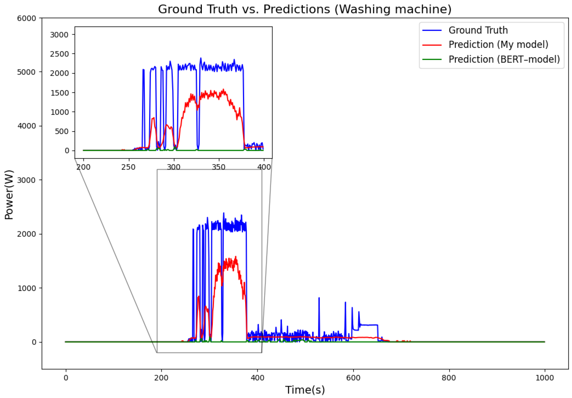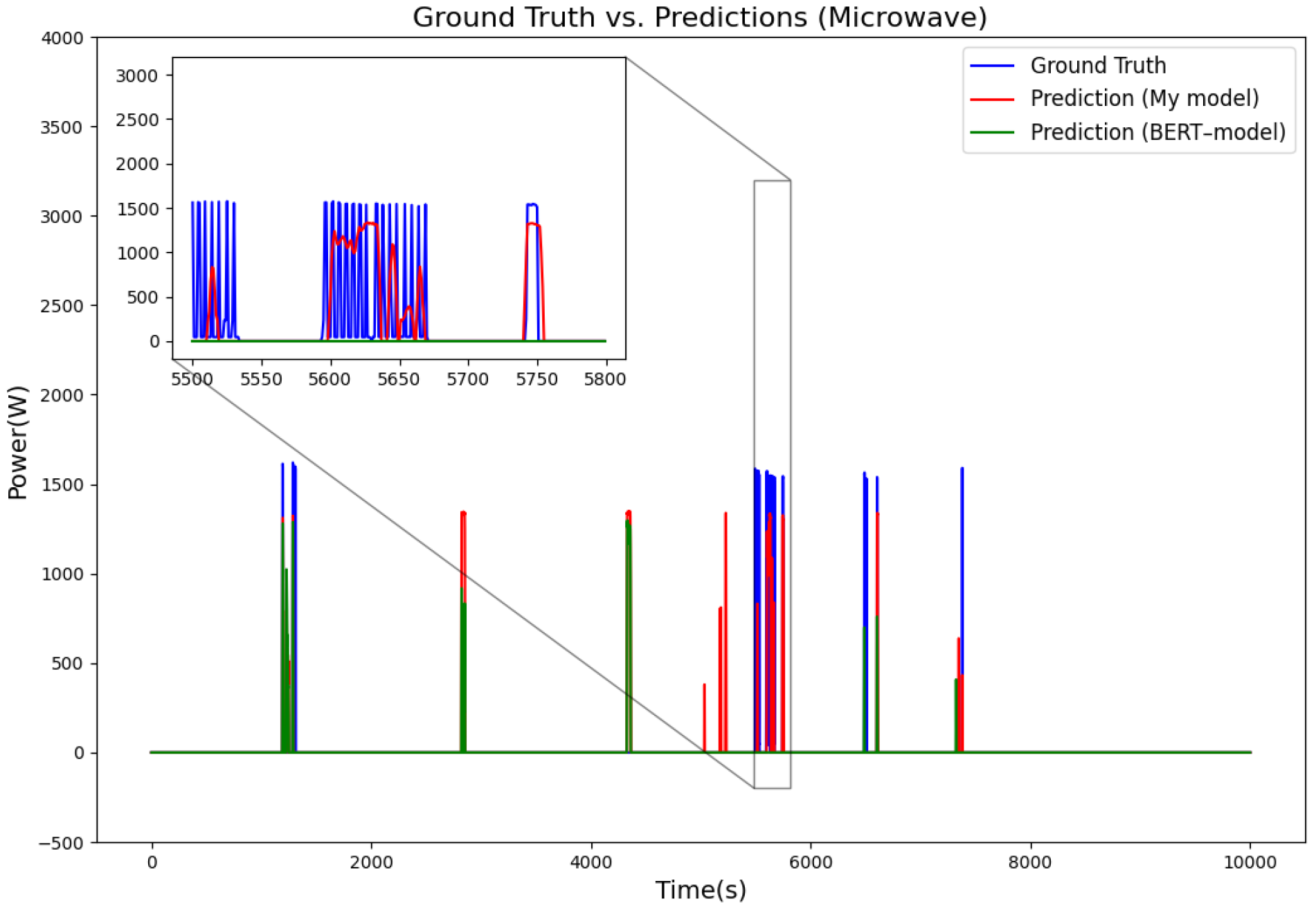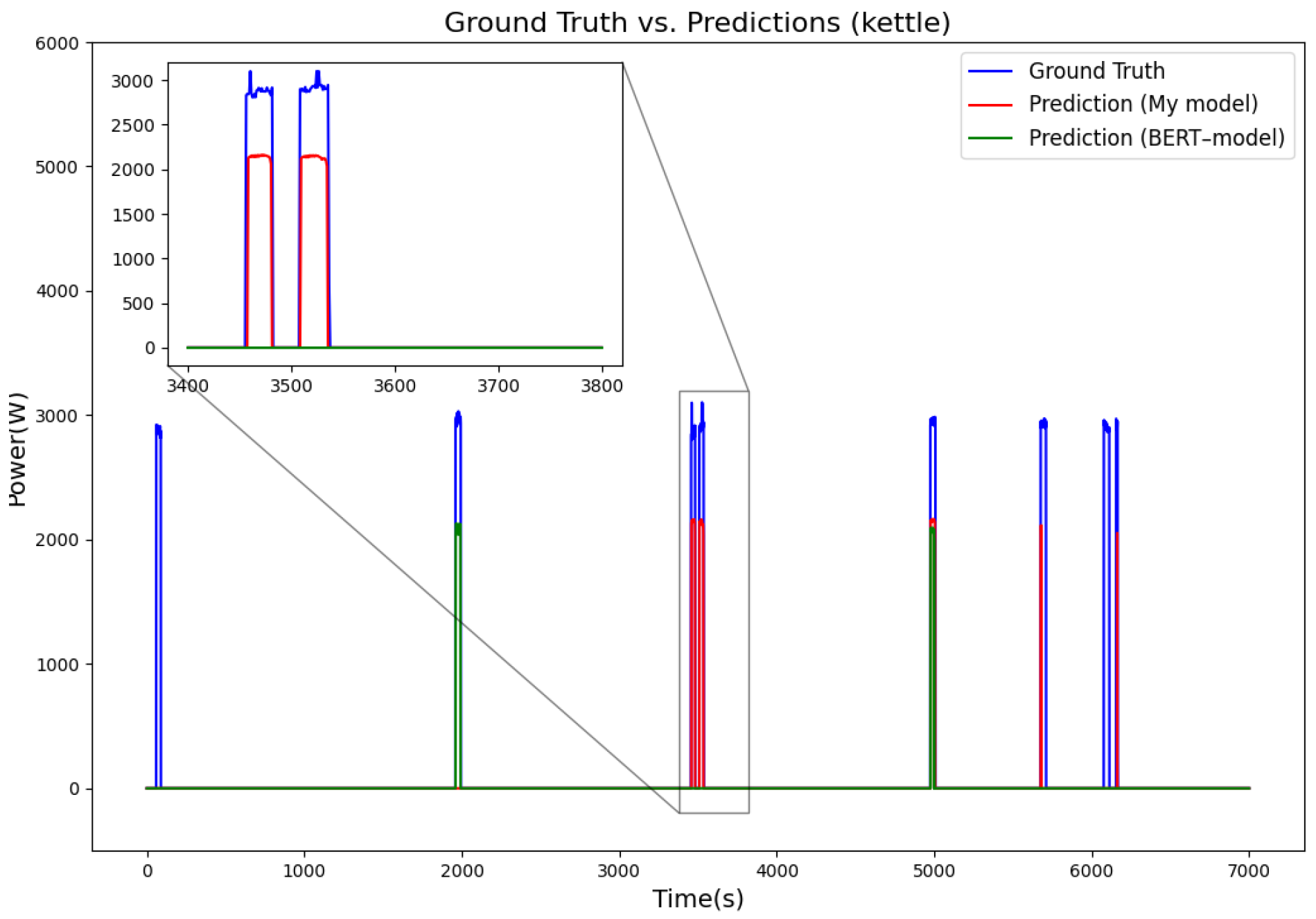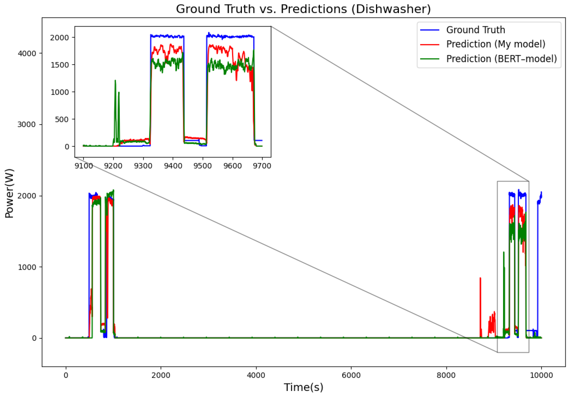 Figure 9 show the disaggregated power consumption curves for the refrigerator, kettle, dishwasher, and washing machine in the UK-DALE dataset. From the trend of the curves, it is evident that the power fluctuations predicted by our model are smoother, allowing it to more accurately track the actual load variations in the appliances. In contrast, the BERT model exhibits larger deviations in some cases, particularly during moments when the devices are turned on or off, where the power predicted by BERT often lags or fluctuates significantly. Additionally, the zoomed-in sections show that the model’s predicted power changes align more closely with the real values, whereas BERT tends to show abnormal spikes or false positives at certain moments. Compared with the BERT model, the model’s predictions are closer to the true values. Combining BiLSTM and transformer structures can not only extract key features of short-term power changes through BiLSTM but also capture long-term dependencies using the transformer. In contrast, although BERT relies on the transformer structure and can learn long-term dependencies between input sequences via self-attention mechanisms, it underperforms when dealing with short-term high-frequency load patterns. BERT lacks explicit sequential modeling capability, making it difficult to precisely capture the subtle changes during appliance on/off cycles, leading to a higher rate of false negatives for short-term high-power appliances (e.g., microwave, kettle).