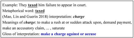 - Wan, H.; Lin, J.; Du, J.; Shen, D.; Zhang, M. Enhancing Metaphor Detection by Gloss-based Interpretations. In Proceedings of the Findings of the Association for Computational Linguistic: ACL-IJCNLP, Online, 1–6 August 2021; pp. 1971–1981. [Google Scholar]