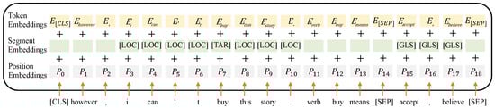 The target encoder serves both metaphor detection and metaphor interpretation. Taking the example in Figure 2, “buy” is the given target word. The input sequence of the target encoder is represented by the sum of three embeddings, including token embeddings, segment embeddings and position embeddings, as shown in Figure 3. Token embeddings and position embeddings are kept the same as BERT. Different from the setting of BERT, new tags are introduced in segment embeddings. To emphasize the target word, the tag for target words “[TAR]” is inserted into the embeddings [24]. The local context is a comma-separated clause containing the target word which is utilized in existing work [8,24]. In this paper, we also add the tag of local context “[LOC]” to enhance the semantic characteristics of the context. Additionally, the “[GLS]” tag is added to indicate the gloss corresponding to the word.