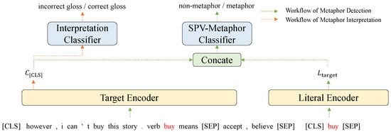 where “[CLS]” and “[SEP]” are special tokens introduced in BERT. The sequence begins with the sentence context ss followed by the and the target word , providing the model with the syntactic and semantic environment of the metaphor candidate. The trigger word “means” acts as a bridge to prompt the model to predict the definition. The candidate gloss is placed after the “[SEP]” token, which allows the model to compute the attention score between the context and the gloss, thereby determining if the gloss is the correct interpretation of in the given context. An example is composed of the input sequence and the metaphor label , and the interpretation label . If a target word is metaphorical, then the metaphor label is metaphorical for all samples for .