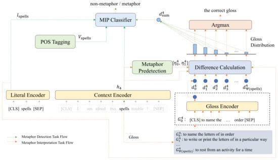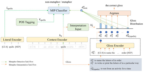 According to the direction of the data flow, the results of metaphor detection are affected by the context, gloss, literal semantic, and part-of-speech tagging of the word, while metaphor interpretation is only affected by the context and gloss. In addition to the context semantic representation vector and literal semantic representation vector for metaphor detection based on the MIP theory, the interpretation semantic vector based on glosses, in Figure 6, is introduced to enhance context semantics. Additionally, metaphor interpretation and metaphor detection share a context encoder, which makes the semantics affected by the metaphor interpretation task also affect the metaphor detection task. Meanwhile, the correct gloss depends on context semantic representation vector of the word and gloss encoding vectors of the word. For each word in the input sentence, both metaphor detection and metaphor interpretation tasks should be carried out simultaneously.