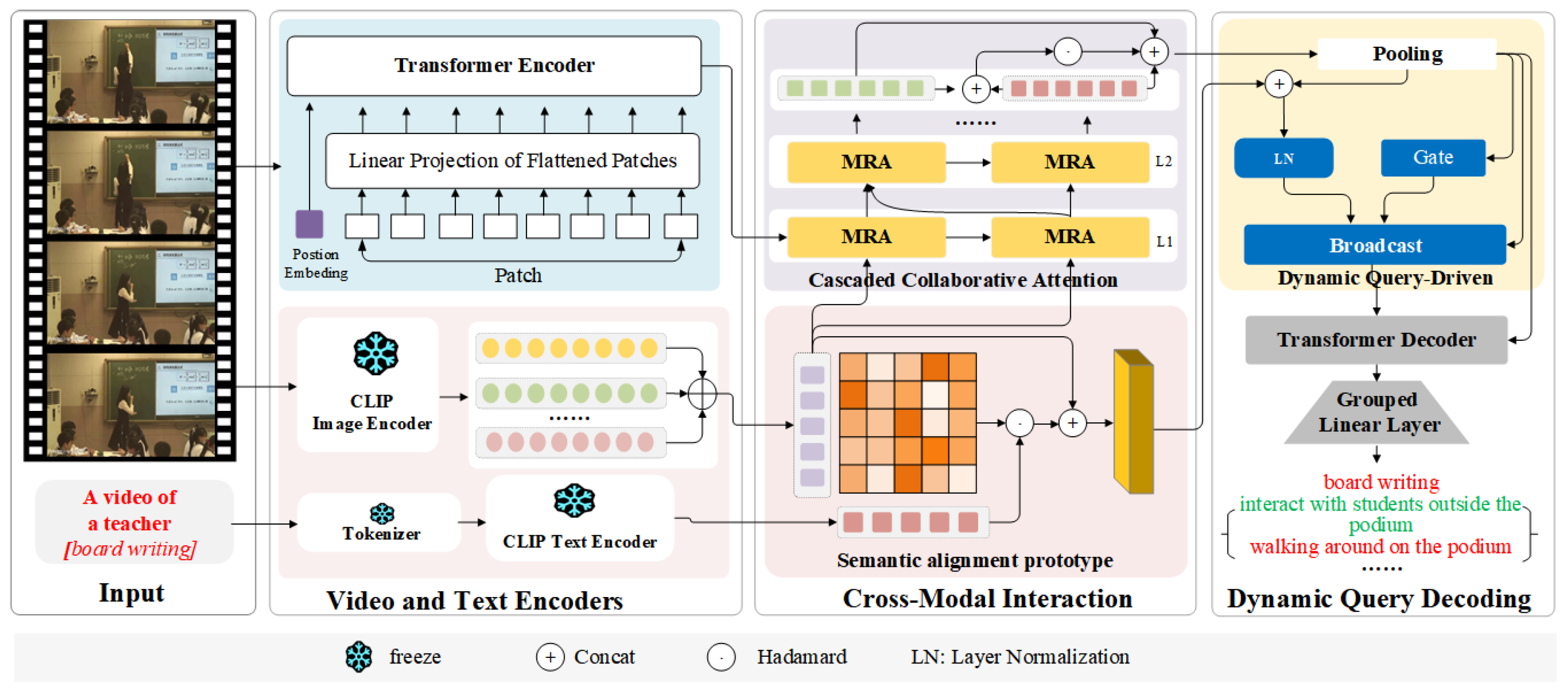 - A Dynamic Query-Driven (DQD) mechanism is introduced. Guided by semantic prototypes, DQD utilizes an adaptive gating module to filter discriminative behavioral features, thereby enhancing the perception and recognition of key teaching behaviors in complex scenarios.