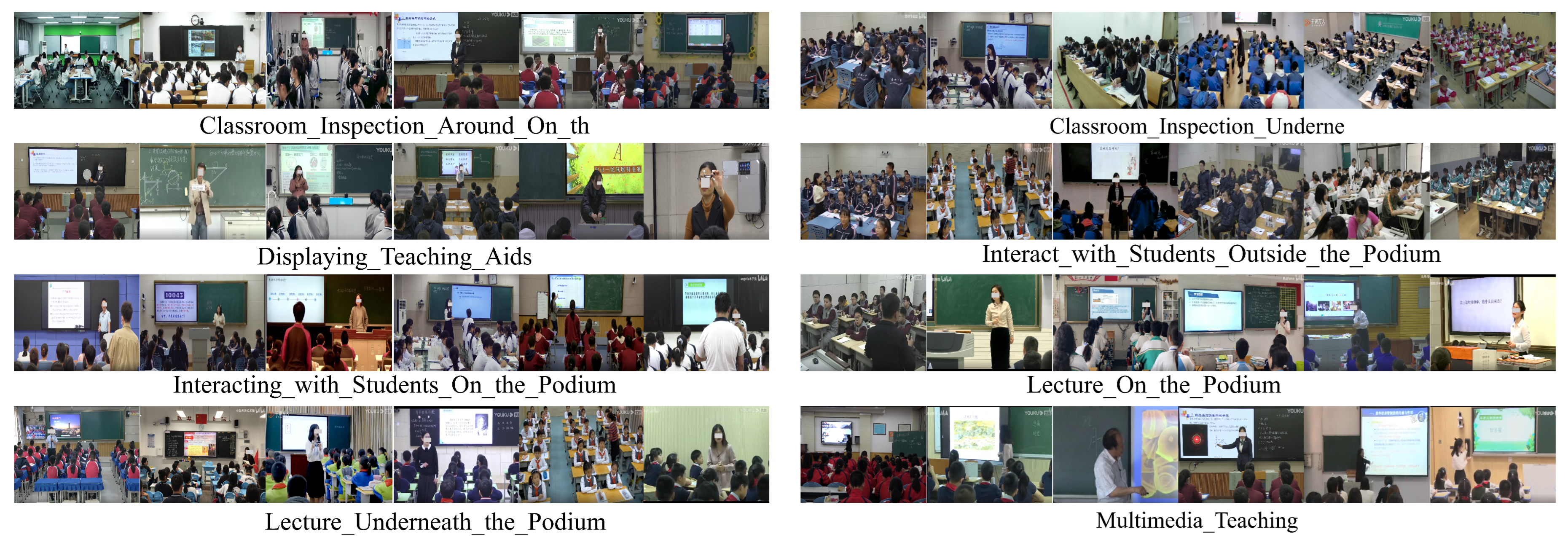 - Cai, T.; Xiong, Y.; He, C.; Wu, C.; Cai, L. Classroom teacher behavior analysis: The TBU dataset and performance evaluation. Comput. Vis. Image Underst. 2025, 257, 104376. [Google Scholar] [CrossRef]