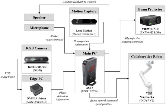 A beam projector and an RGB camera are mounted on the upper frame of the workcell. The RGB camera provides environmental perception for component detection and workspace monitoring, while the projector generates real-time AR overlays—including task instructions, component locations, assembly targets, and reactive virtual buttons—directly on the work surface. A motion-capture sensor is installed at the front of the workspace to track hand articulation and fingertip movement, enabling gesture-based selection of projected UI elements and hands-free interaction with the workcell. The collaborative robot is positioned on the side opposite the user’s seating location, facing the worker across the task surface. This layout ensures a clear interaction field for the user while allowing the robot to perform cooperative actions such as component delivery, holding, positioning, and sequential task assistance. Robot actions follow a structured workflow defined in the collaboration database, ensuring consistent execution of process-level cooperative behaviors.