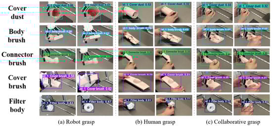 To further improve detection stability in the presence of intermittent occlusions, the pipeline incorporates TCAT (Time-Consistent Adaptive Thresholding), which adjusts confidence thresholds across consecutive frames based on temporal consistency. TCAT effectively suppresses unstable detections and mitigates jitter, yielding temporally coherent outputs even when objects are partially occluded. Representative qualitative results obtained using the YOLOv12 + TCAT pipeline under diverse operational conditions—including hand occlusion, robot-grasp motion, and pose variation—are presented in Figure 3, illustrating the robustness of the adopted perception module across the five target object categories.