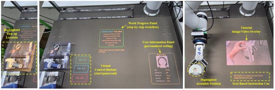 The projection-based information feedback system developed in this study is designed to provide workers with intuitive visual cues directly within their task space, thereby enhancing task comprehension and supporting step-by-step execution of manufacturing procedures. The system is implemented as a WPF-based AR interface, in which all projected UI elements—including highlight effects, task-sequence panels, virtual control buttons, tutorial images and videos, and user-specific information—are developed as independent visualization components. Each component is dynamically updated in real time, and the projected imagery is spatially aligned with the physical work surface through a calibration and projection-mapping process, ensuring accurate geometric correspondence with the workspace. To illustrate the functionality of the AR interface, Figure 4 presents representative examples of the visualization components rendered on the work surface. These include (i) a highlight effect projected onto the target pickup location to guide the worker toward the correct part, (ii) a task-progress panel in which the currently active step is emphasized while completed steps are visually deactivated, (iii) virtual control buttons enabling the worker to initiate, pause, or terminate a task sequence, and (iv) context-specific instructional media such as tutorial images, videos, and textual guidance projected near the relevant assembly region. Together, these projected elements provide immediate, spatially contextualized feedback that supports both procedural understanding and workspace navigation.