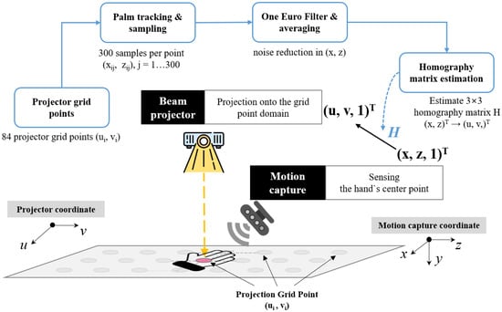 The gesture-based interaction module enables contactless command input by mapping the user’s hand motions onto the projected user interface. Prior to runtime operation, a calibration procedure is performed to align the motion-capture coordinate system with the projector’s pixel coordinate frame. As illustrated in Figure 5, this procedure begins by sampling the palm-center position over 84 predefined grid points on the work surface, with approximately 300 measurements collected per point. The sampled positions are denoised using the One Euro Filter, and the averaged values are used as representative coordinates. These coordinates are paired with the corresponding projector-domain pixel locations to estimate a homography matrix via a least-squares formulation, thereby compensating for scale discrepancies, planar distortions, and perspective effects between the two coordinate systems.