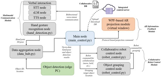 The proposed modular collaborative workcell operates on a Linux-based main control PC, where all core functionalities are deployed as ROS-style Python (v3.6) nodes. These nodes handle gesture recognition, verbal interaction, object perception, robot actuation, and projection-based user interfaces in a distributed yet tightly coordinated manner. The overall software topology is summarized in Figure 8, which delineates the data flow and control hierarchy across the system’s interaction, perception, and execution layers.