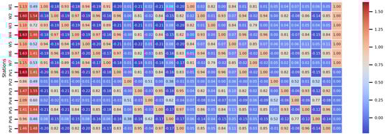 Based on the framework proposed in this paper, we first construct the output similarity matrix for the target wind-solar cluster. The row vector of F represents the eigenvector of power plant i. Each element of the eigenvector includes the coefficient of variation in power output , the coefficient of variation of key meteorological elements , the Spearman rank correlation coefficient between power outputs of all power stations , and the Spearman rank correlation coefficient between key meteorological elements of all power stations . To account for the inherent output pattern differences between wind and solar power, an additional label is assigned to each power plant: wind plants are marked as 1, and solar plants as 0. The final output similarity characteristic matrix F for all power plants is 14 × 31 in shape, as shown in Figure 4.
