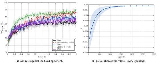To evaluate the effectiveness of the proposed VBRS algorithm, we report two complementary metrics. (1) Win rate against the opponent. We use the win rate against the opponent policy (the best-performing fixed opponent defined in Section 4.3) as the primary metric to reflect the final adversarial effectiveness of the learned policy. (2) Estimated return under the preset handcrafted environment reward. In addition, we report an estimate of the original objective , the expected discounted cumulative return under the preset reward defined in Equations (34)–(37). This metric is reported to highlight that maximizing the handcrafted reward objective is not necessarily equivalent to maximizing adversarial performance, and a bias may exist between the two.