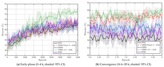 In the final convergence window (16 k–20 k), Figure 4b shows that VBRS stabilizes at a markedly higher win rate than other baselines. Table 2 summarizes the final win rates by averaging the last 10 evaluation points per seed and then reporting mean ± 95% CI across seeds. The PPO Without VBRS achieves (95% CI: ), while the PPO with VBRS with a dynamic schedule achieves (95% CI: ), i.e., an absolute gain of in win rate. Among the shaping baselines, PBRS improves over PPO to (95% CI: ), whereas RND yields (95% CI: ), both remaining below VBRS. The fixed- ablation (VBRS with fixed) performs worse than the dynamic- variant, supporting the necessity of adapting during training.