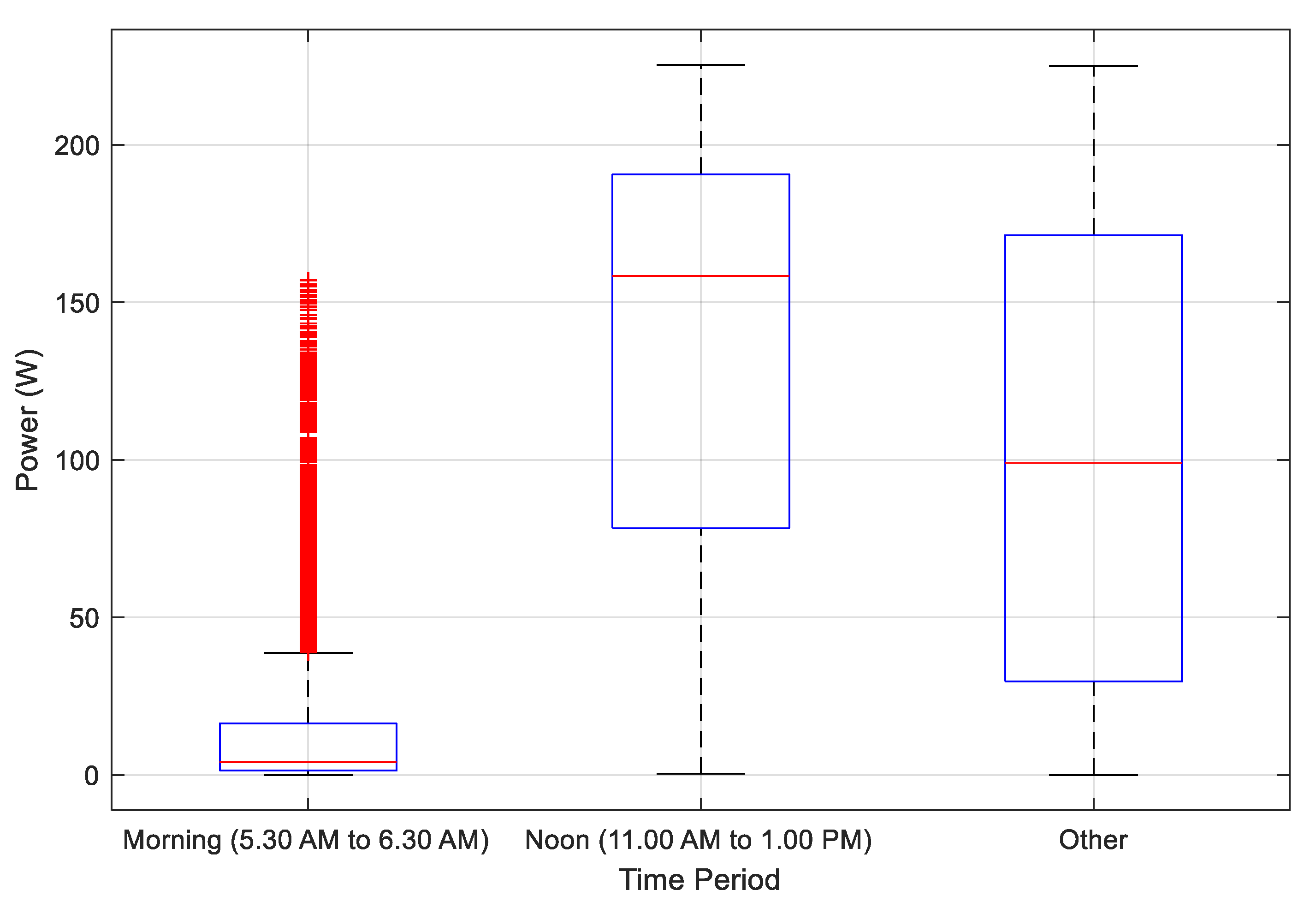 Figure 9, although the morning scenario exhibits a low median power value, these values are present in the dataset to reflect transient fluctuations and sensitivity during the early hours. Since they are limited in number and do not significantly affect the regression analysis, they do not distort the overall statistical trend.