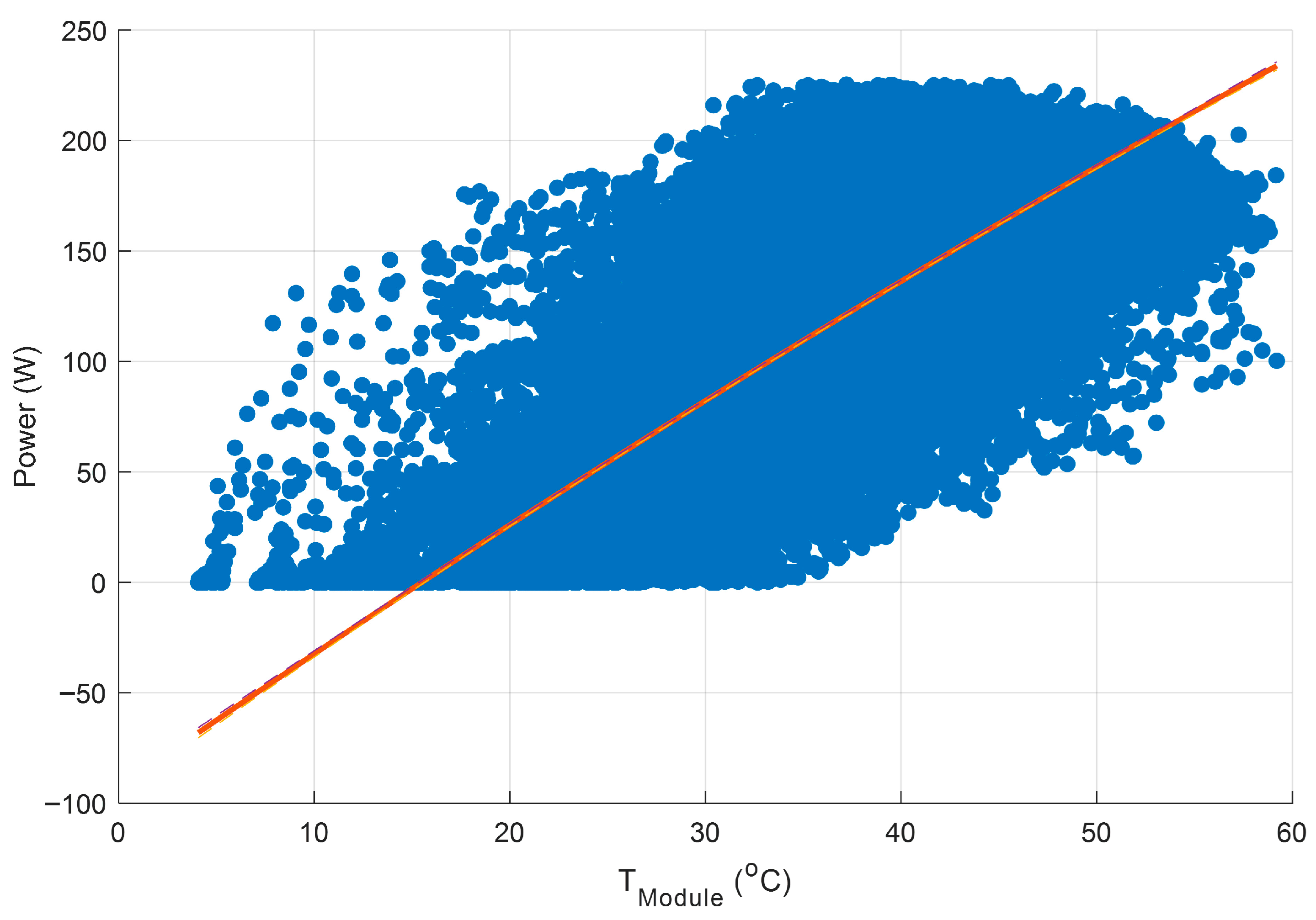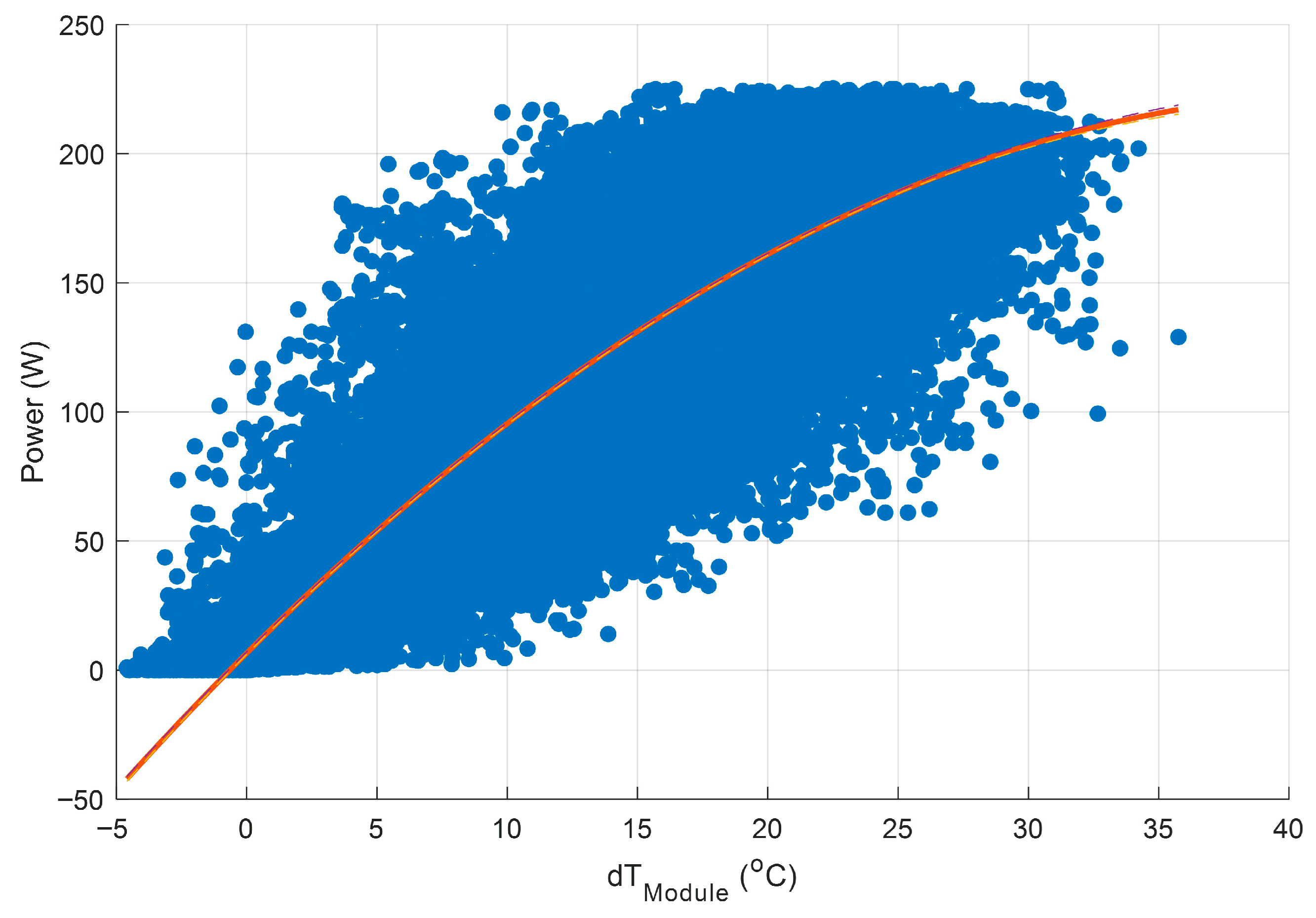 Figure 13, when power is plotted directly against the absolute module temperature, the quadratic fit yields