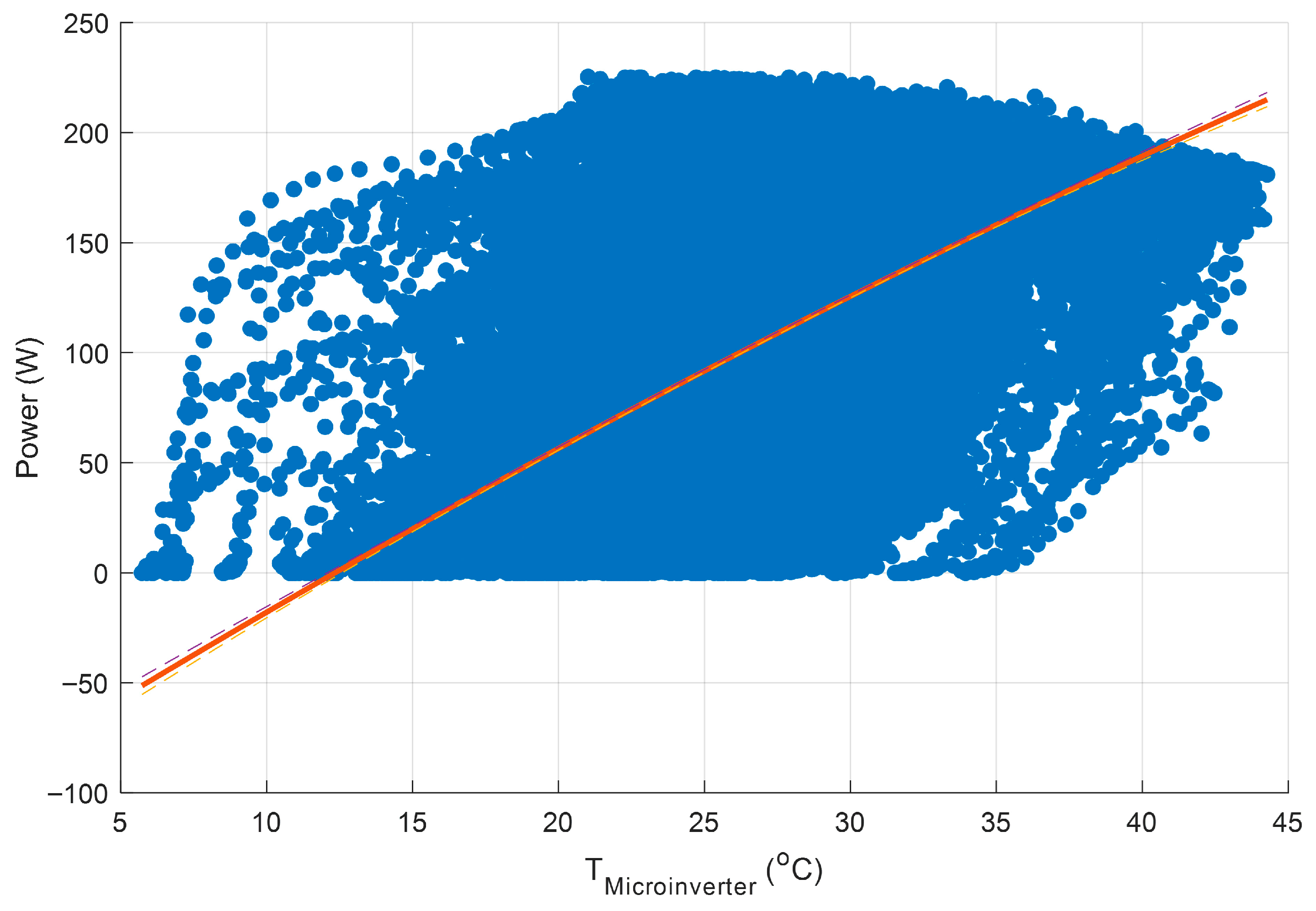 Microinverter thermal stress is also relevant. The temperature rise in the microinverter, , also shows a high with power. While slightly less informative than , this variable still explains a substantial portion of the power variation. This is also consistent with the expectations.