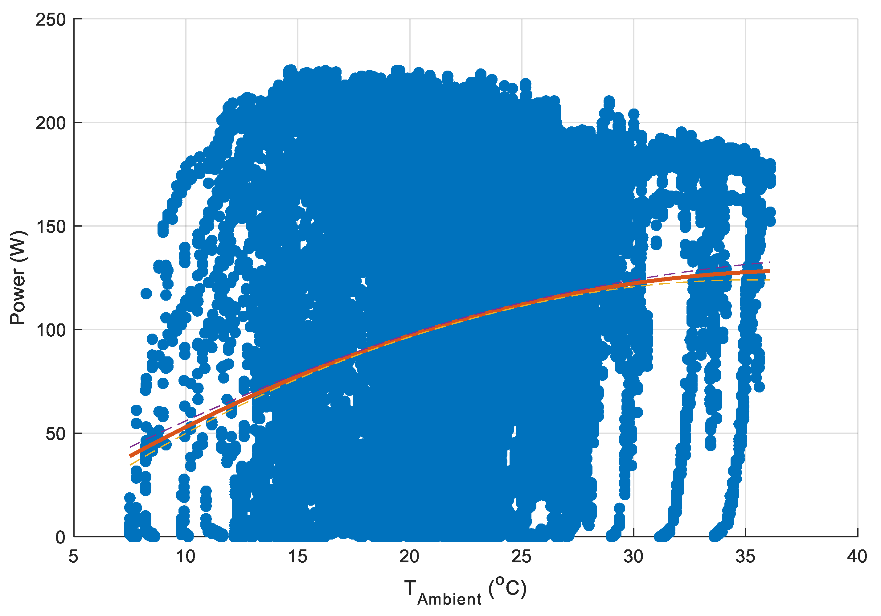 Figure 15, as expected, AC power exhibits a strong positive dependence on irradiance, with a quadratic fit yielding