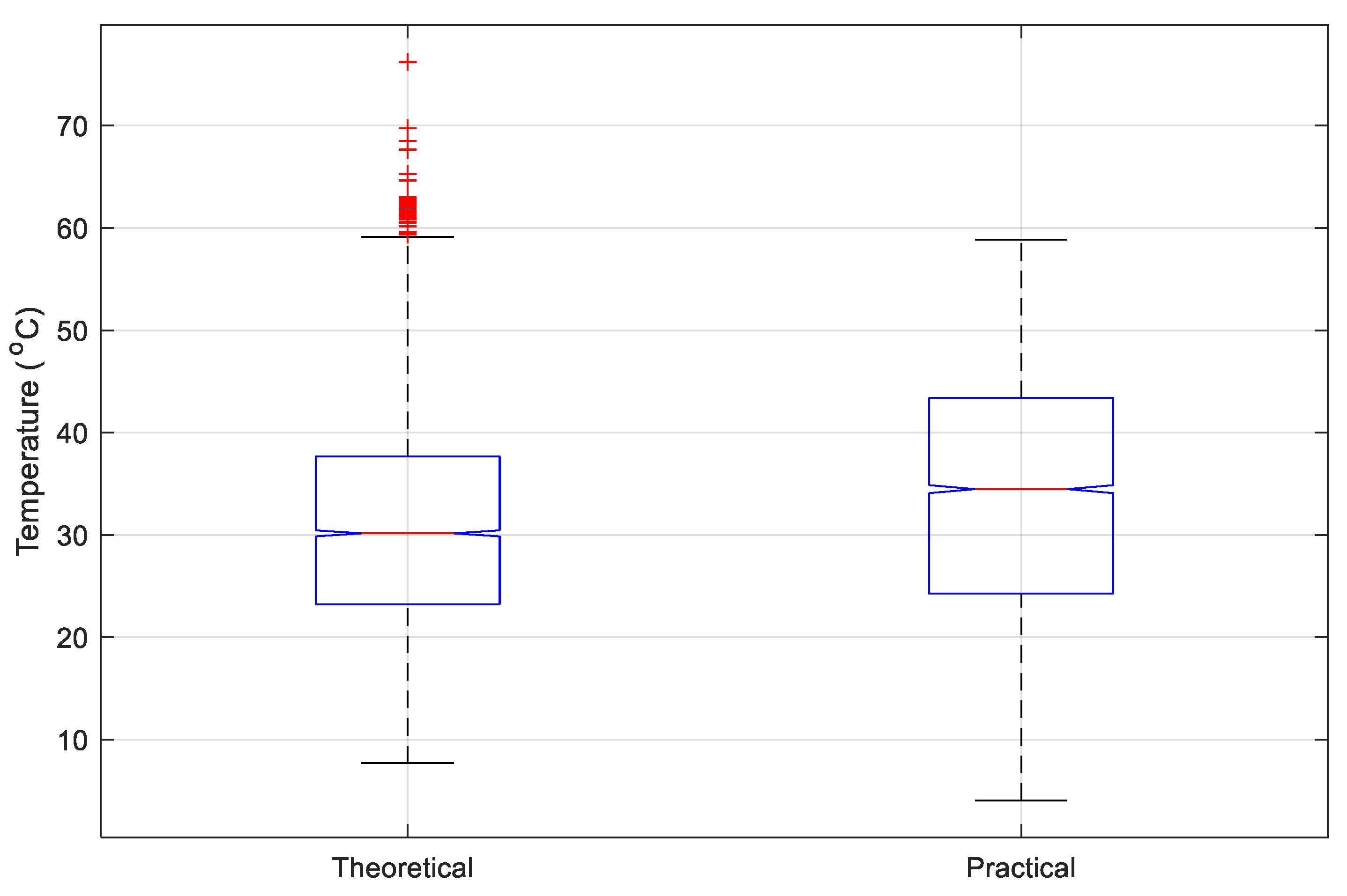 Overall, the theoretical temperature profile reproduces the main trends observed in the measurements. In the 25th percentile, the theoretical and practical values are 23.24 °C and 24.26 °C, respectively. In the 50th percentile, the average theoretical value is 30.16 °C and the average practical value is 34.48 °C. In the 75th percentile, the theoretical and practical temperatures are 37.69 °C and 43.38 °C, respectively. The upper adjacent for the theoretical value is 59.14 °C and it is 58.83 °C for the practical value. Therefore, the difference between the theoretical and practical temperatures for the AC-PV module are 4%, 12%, 13%, and 0.5% for the 25th percentile, 50th percentile, 75th percentile, and the upper adjacent, respectively. This comparison indicates that the model is sufficiently accurate to provide a realistic representation of the module’s thermal behavior for system-level analysis and design. Importantly, the estimated temperatures remain within acceptable operating limits that are consistent with the earlier estimation and thermal studies of the AC-PV module in [