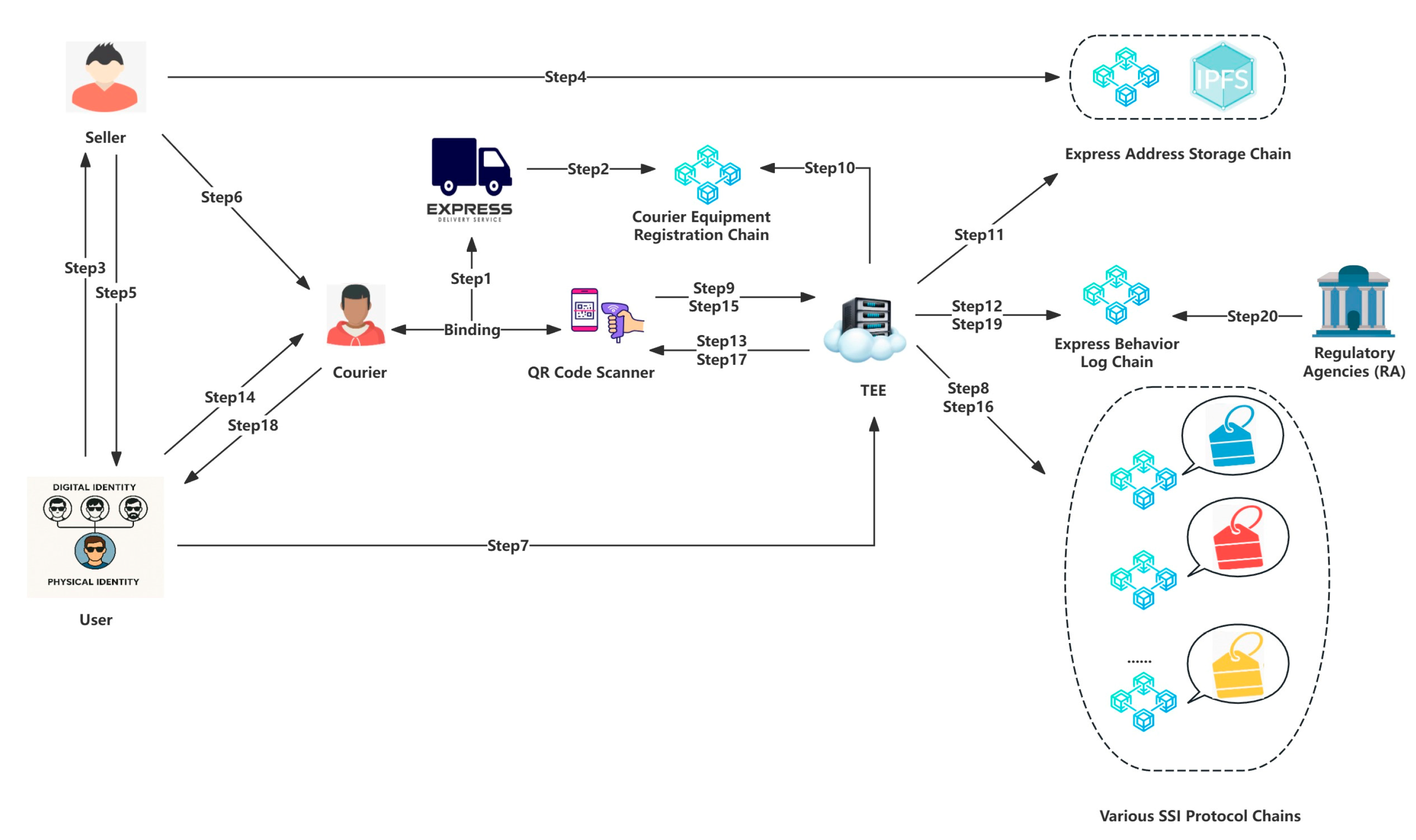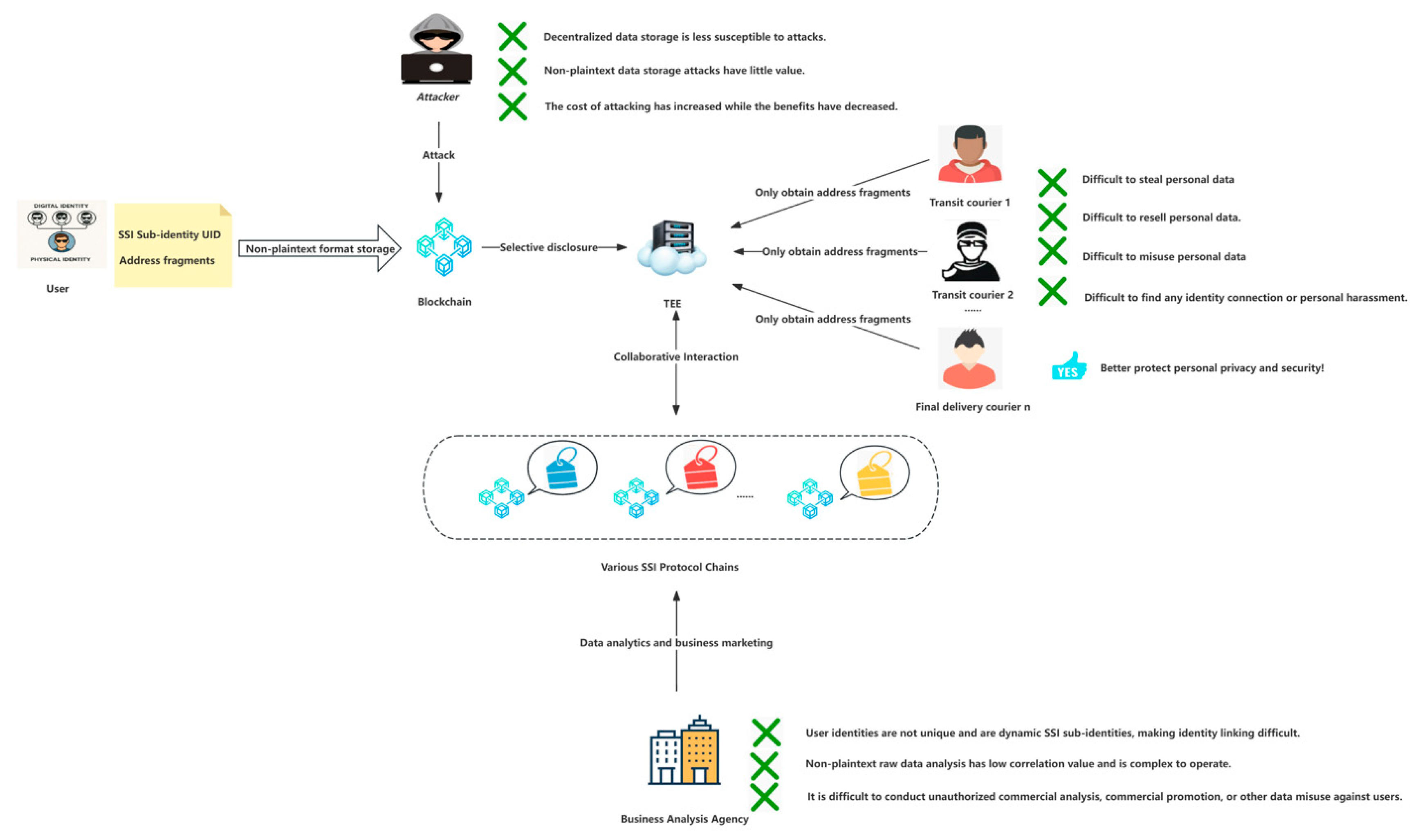 - Users can register and obtain a unique self-sovereign identity (DID) and derive or apply for sub-identities as UIDs for logistics purposes. In this process, the self-sovereign identity replaces the user’s original real name and phone number, significantly reducing the exposure of these high-value plaintext data. Additionally, users’ address information is segmented, encrypted, and stored on a decentralized blockchain, preventing courier companies from directly reading or using it. This effectively eliminates centralized storage and data monopolization issues.