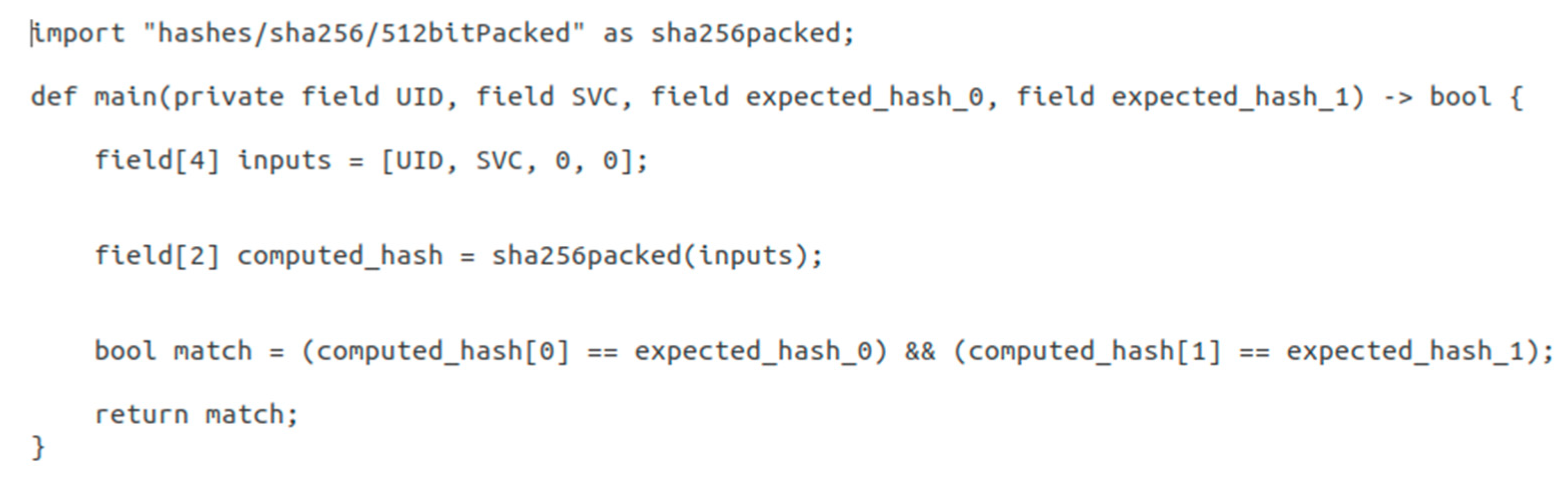 - Kim, G.; Ham, Y.; Ryou, J. Privacy-preserving credential smart contracts using Zokrates. KSII Trans. Internet Inf. Syst. (TIIS) 2024, 18, 2417–2430. [Google Scholar]