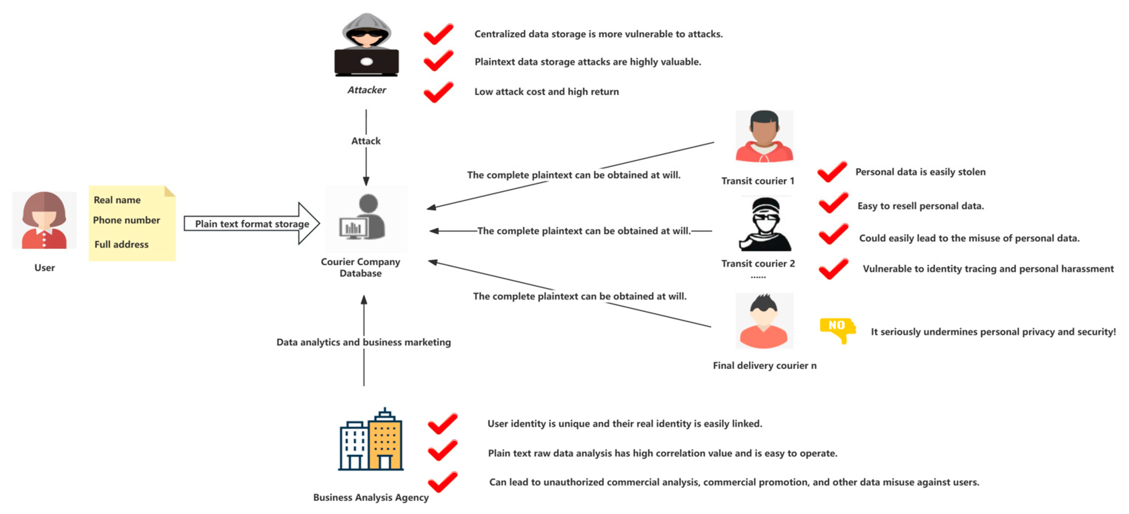 - Commercial analytics companies can exploit users’ plaintext personal information from the logistics process to conduct business analyses, enabling identity linking and unauthorized marketing or promotional activities.