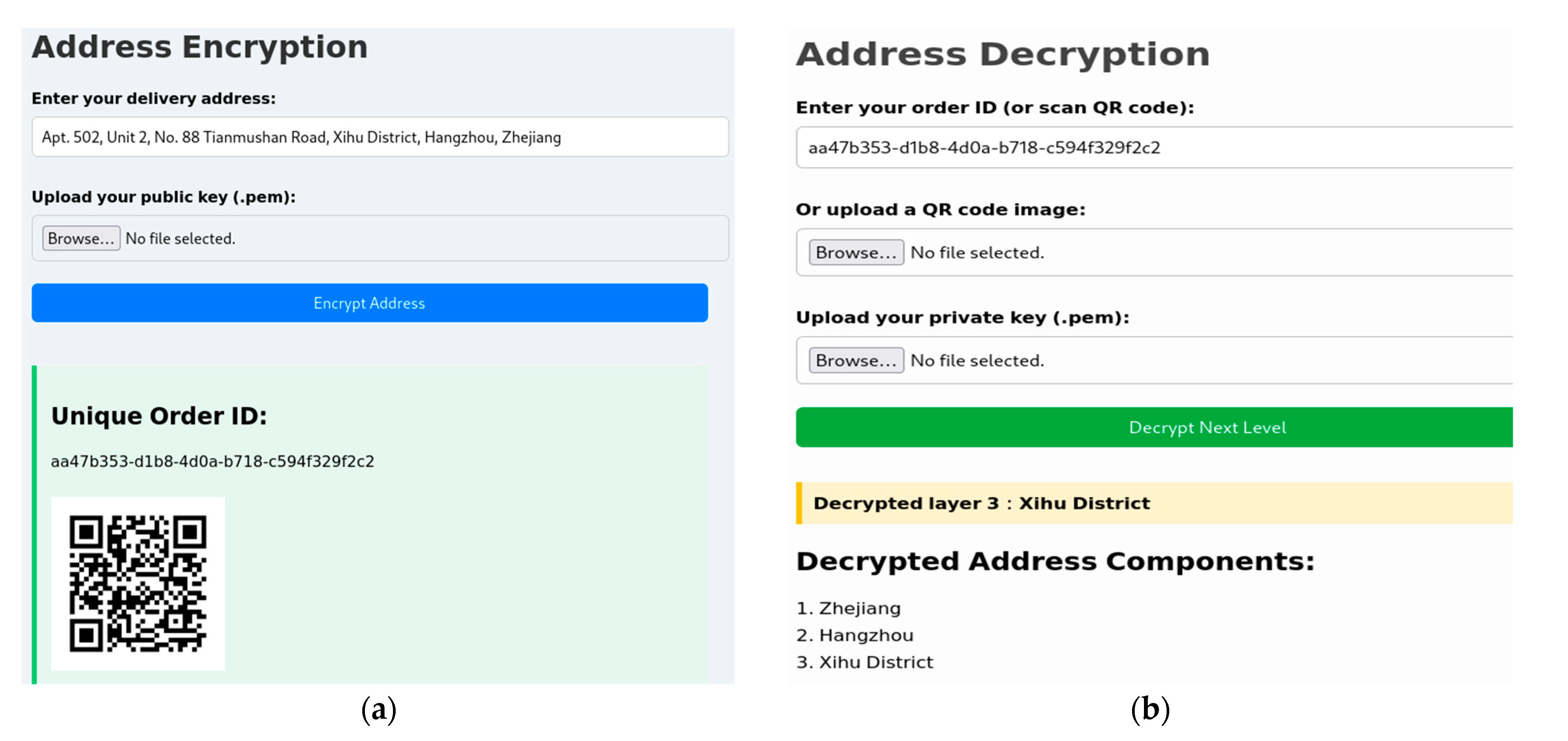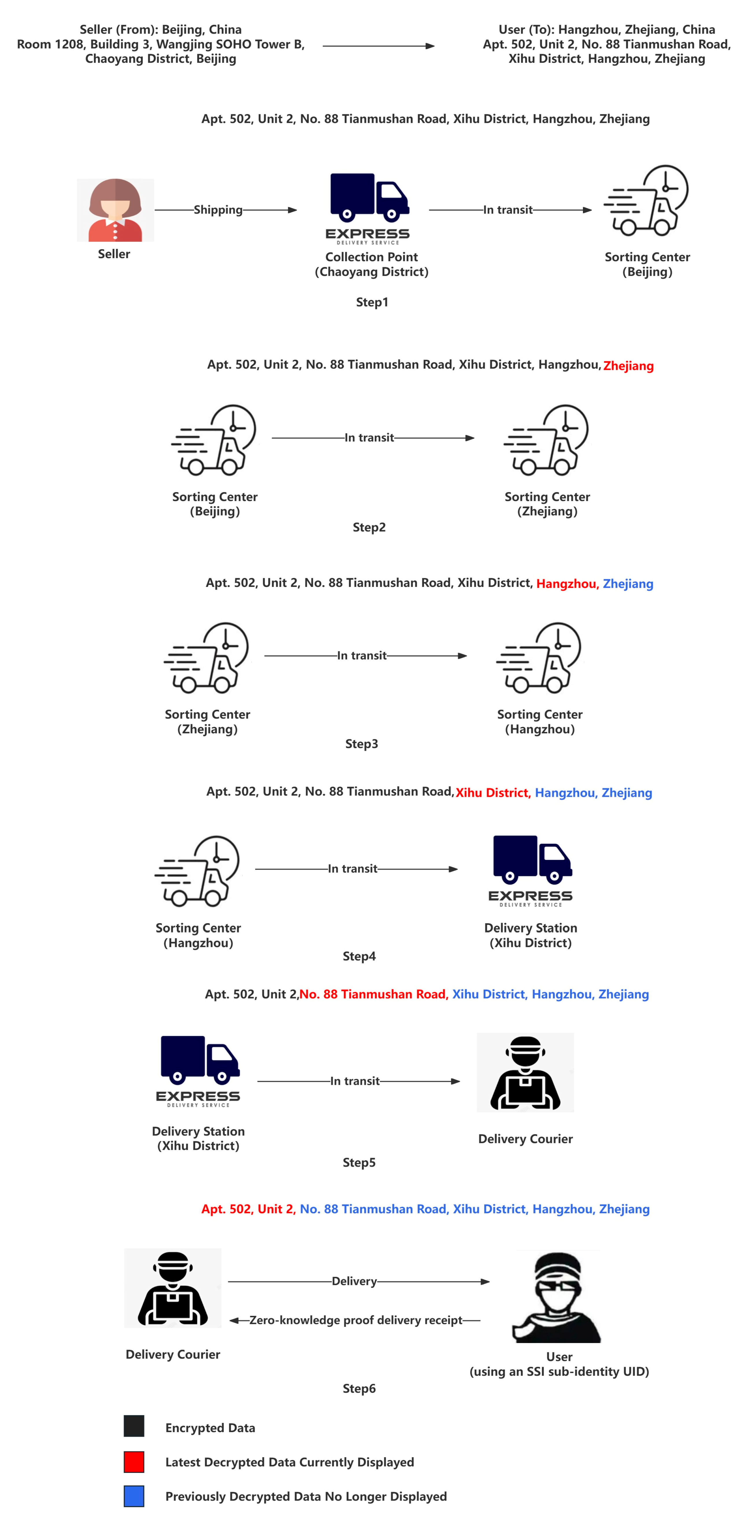 - Leveraging this paradigm, we design and implement a complete solution for a complex logistics delivery workflow. User identities are anonymized through dynamic sub-identities; the delivery address is encapsulated as a cryptographic envelope whose decryption authorization is bound to the parcel’s physical transit states, enabling on-demand, step-wise “peeling” decryption aligned with operational progress. This ensures that sensitive personal attributes such as the user’s real name and phone number never appear throughout the entire process, while the full address is visible only to the seller and the final delivery courier. All intermediate couriers can access only the minimal address fragment required for their task, achieving strict selective and minimized disclosure.