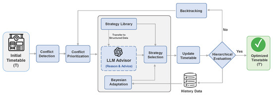 Railway timetabling requires resolving complex scheduling conflicts arising from shared tracks, station capacity limits, and strict safety intervals. Existing optimization or learning-based approaches often struggle to scale or generalize across diverse operational scenarios. We present TrafSched, a novel hybrid decision framework that combines a curated strategy library, multi-dimensional conflict prioritization, Bayesian strategy adaptation and an optional Large Language Models (LLMs) integration module. TrafSched iteratively detects and resolves conflicts through adaptive strategy selection and backtracking, enabling robust exploration of feasible timetables without costly model retraining. Experiments on real-world-scale datasets involving 50–120 trains show that TrafSched consistently outperforms heuristic and reinforcement learning baselines, achieving up to 85.05% conflict-resolution success in the most challenging cases. These results demonstrate TrafSched’s effectiveness and scalability for modern railway scheduling operations. Full article