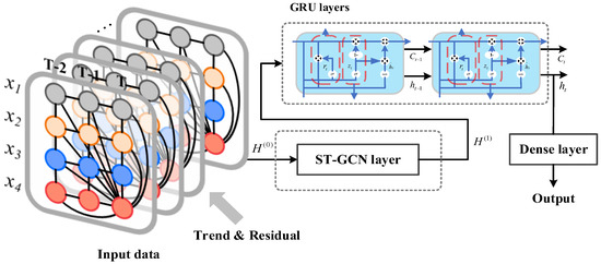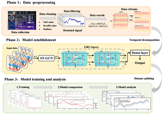 The accurate estimation of shield attitude deviation is related to the quality of tunnel construction. However, the existing recurrent neural network (RNN)-based methods are unable to efficiently capture the spatial correlation between different timestamps (DT) and have poor prediction performance when handling drastically changing attitude data, which makes it difficult to estimate attitude deviation when attitude changes are frequent. This study proposes a shield machine attitude prediction model (ST-GC-GRU) based on a spatial–temporal graph. Different from the traditional attitude prediction methods, the method firstly introduces an improved GCN (ST-GCN: spatial–temporal graph) and the time decomposition technique to enhance its representation of the attitude change information, thus more rationally modeling the comprehensive spatial–temporal dependence of the shield structure operation data. The method demonstrates better prediction performance than previous methods under a large number of real data tests and effectively improves the low-confidence predictions of the prediction model when dealing with large attitude changes. The results indicate that the proposed method is better than the other seven prediction models in four attitude deviation values. The model and the research results can provide a reference for developing adaptive control technology in shield tunnel construction. Full article