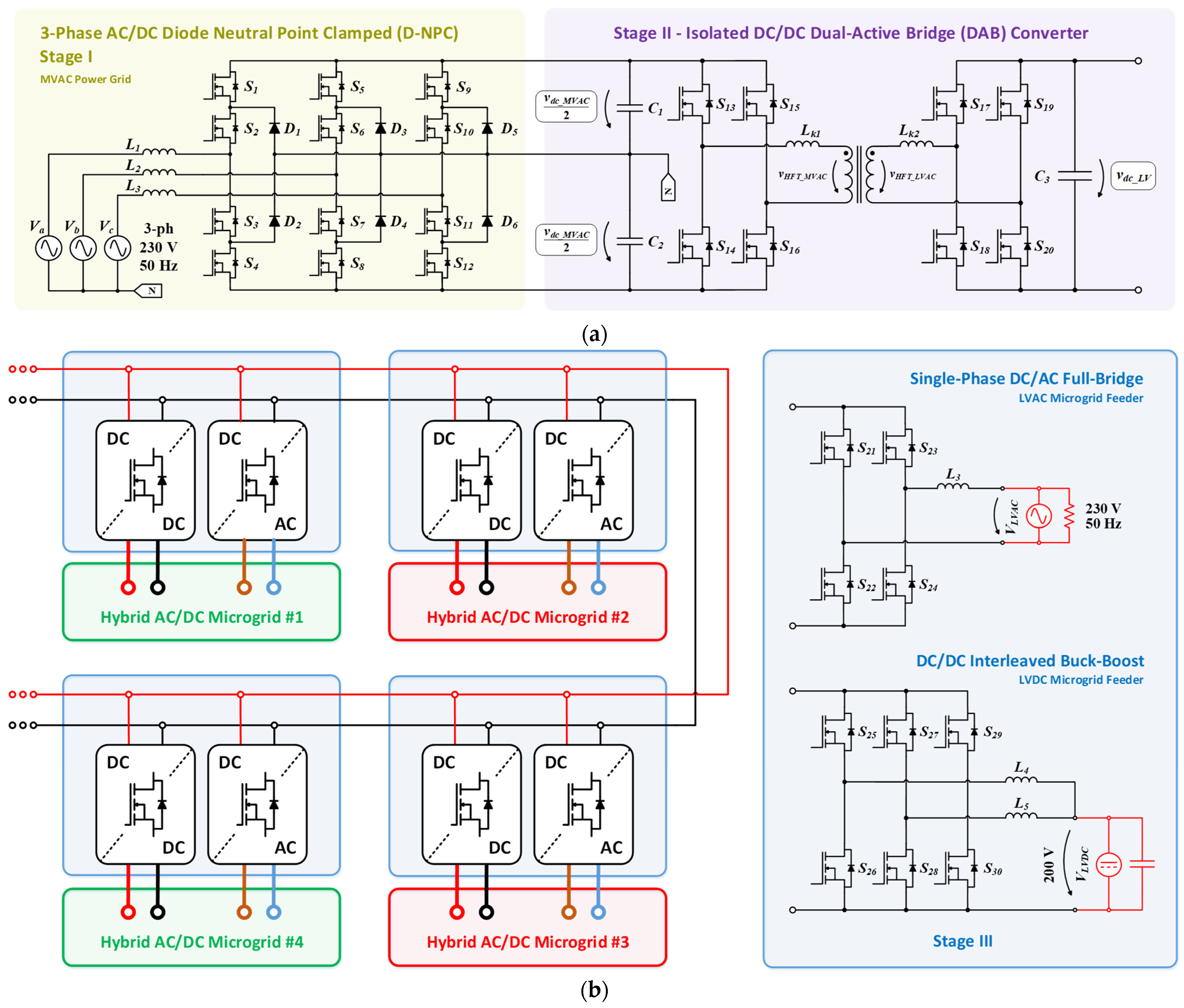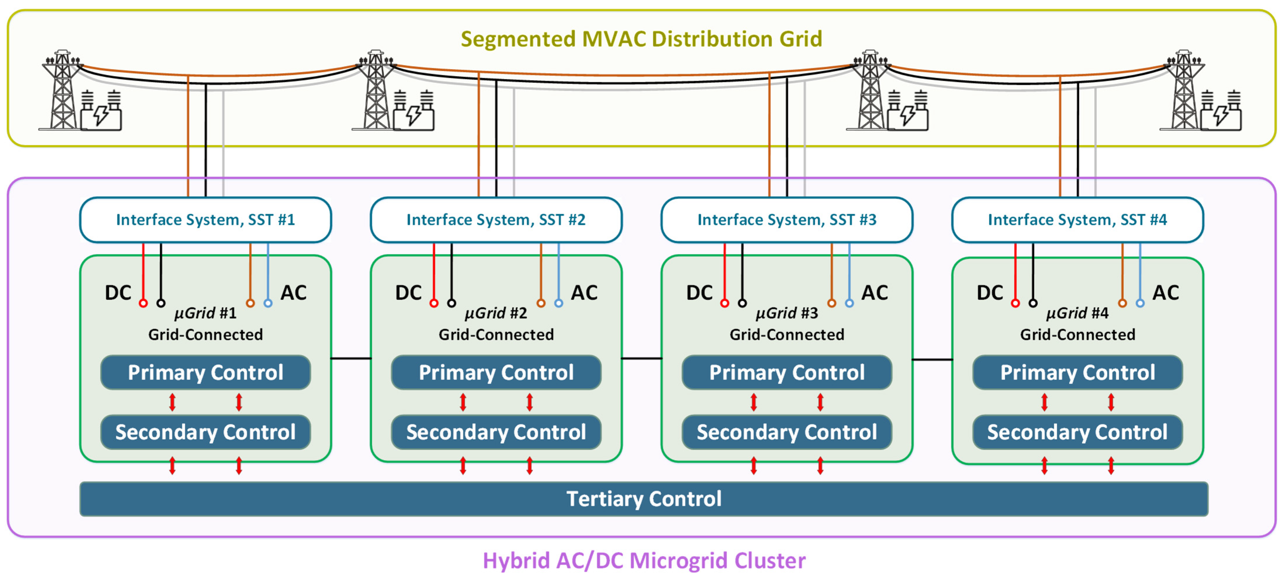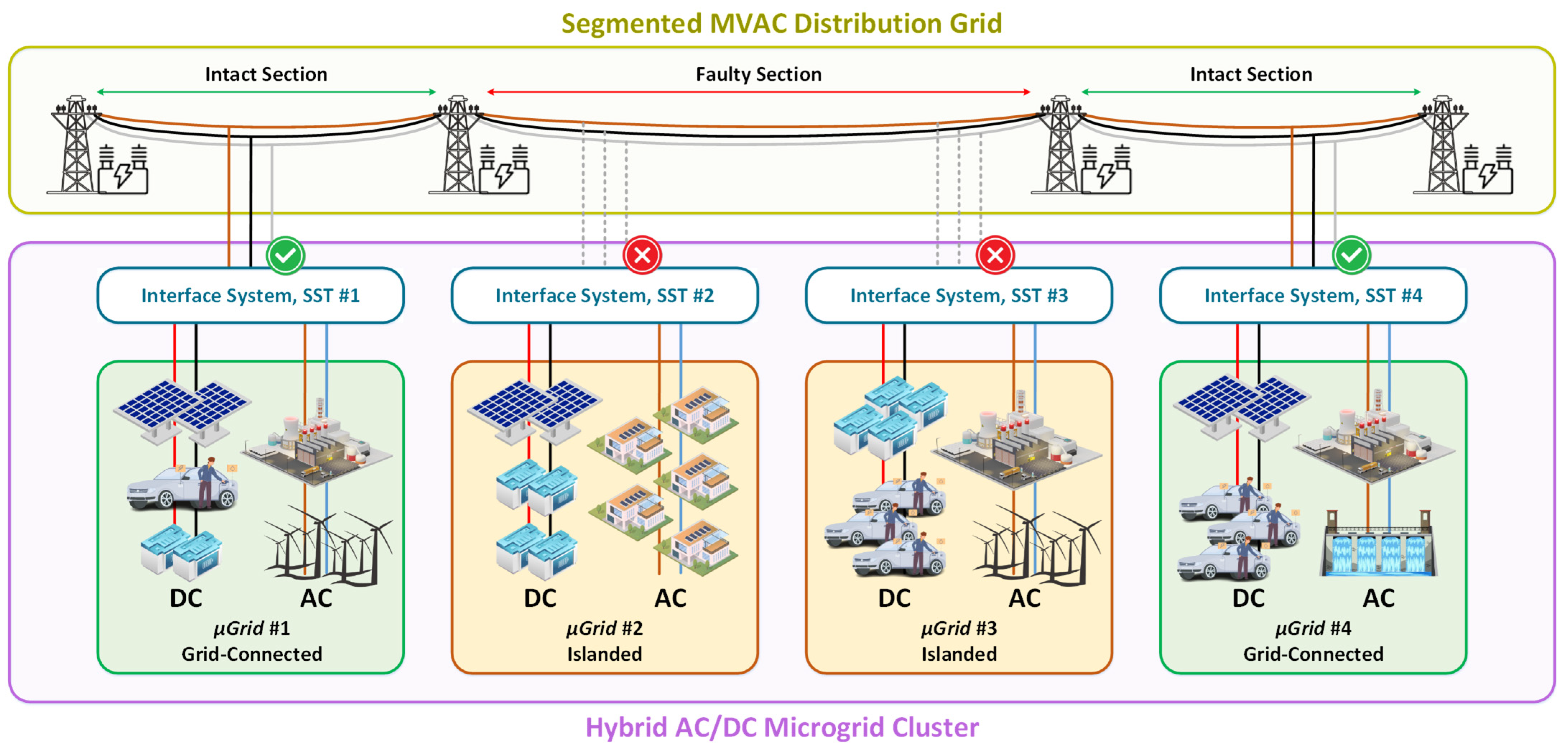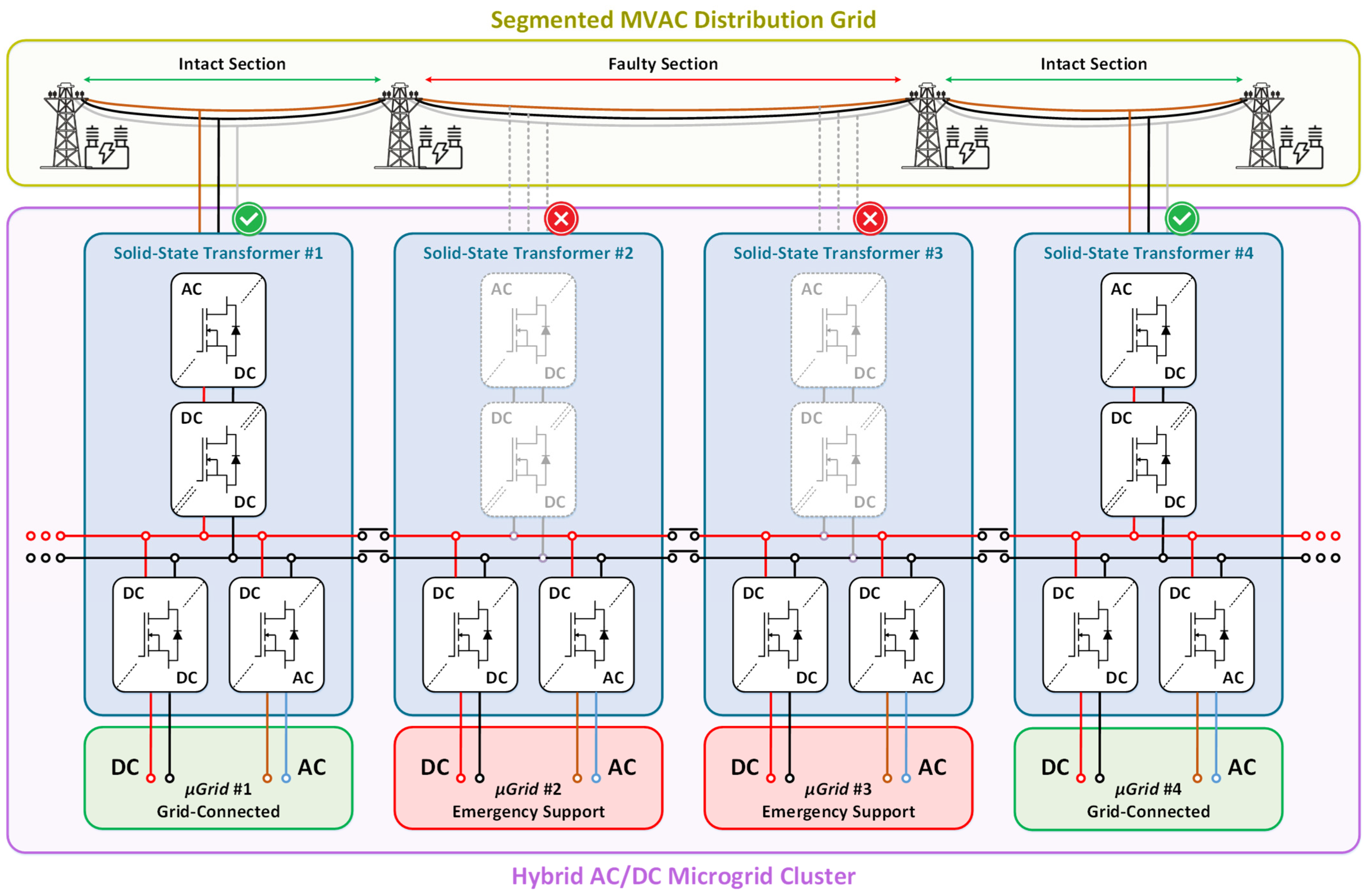 - Introduction of an SST-enabled emergency LVDC power path, maintaining power exchange among microgrids, even when the MV segment is unavailable;