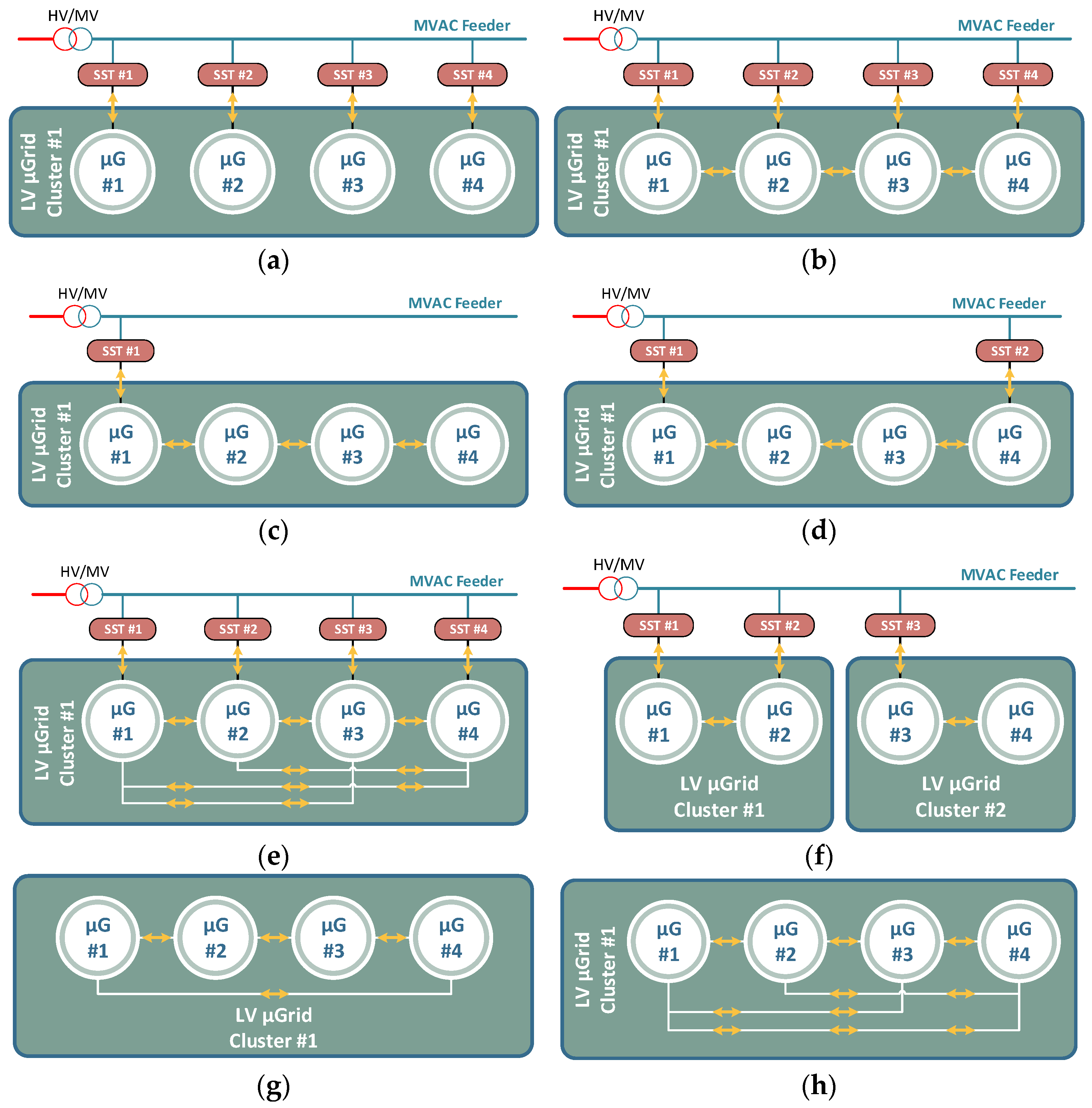 - Proposal of a resilience-oriented concept for clustered hybrid AC/DC microgrids, taking advantage of the reconfigurable architecture of SSTs;