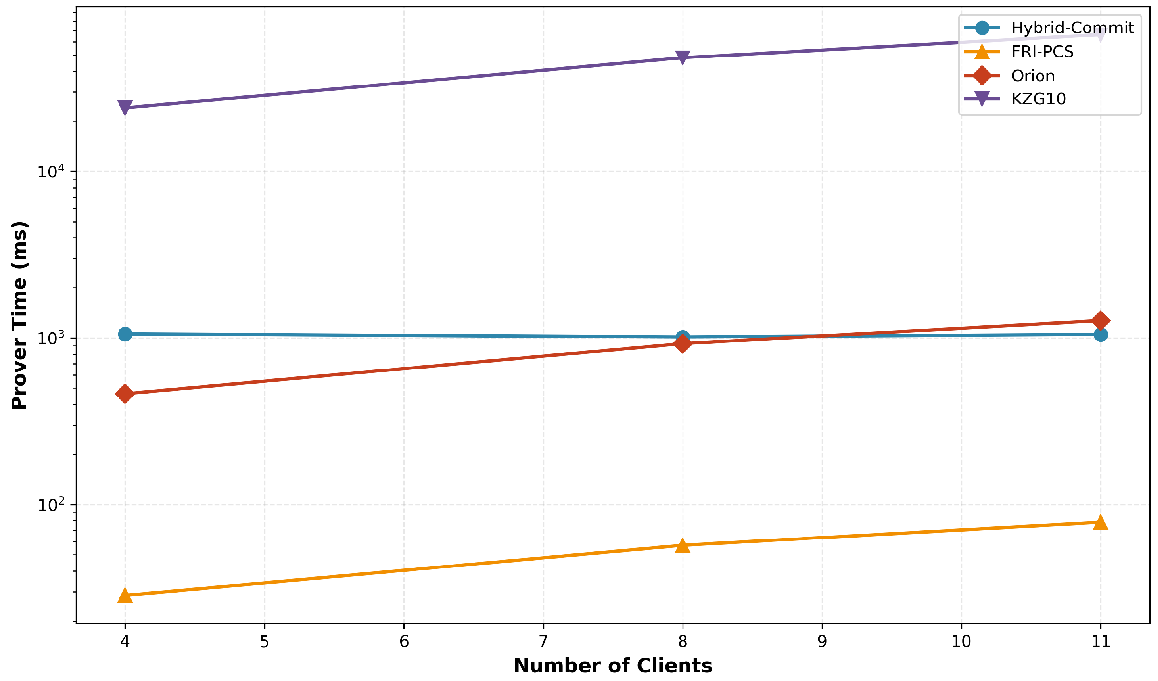In contrast, baseline methods (KZG10, FRI-PCS, and Orion) show linear scaling with client count as each client requires independent proof generation. The logarithmic y-axis highlights the significant performance gap: Hybrid-Commit maintains approximately 121 s per round regardless of client count (4, 8, or 11 clients), with prover time per client remaining stable at approximately 1008 ms (4 clients: 1058 ms, 8 clients: 1015 ms, and 11 clients: 1051 ms). This constant-time behavior is achieved through our batched commitment optimization (Equation (