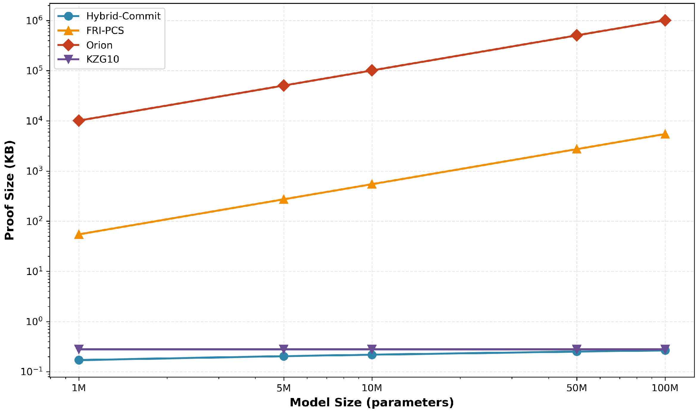 Figure 3 illustrates the per-client communication overhead across different model sizes (1 M to 100 M parameters). The hybrid scheme’s proof size grows sublinearly due to two key optimizations: